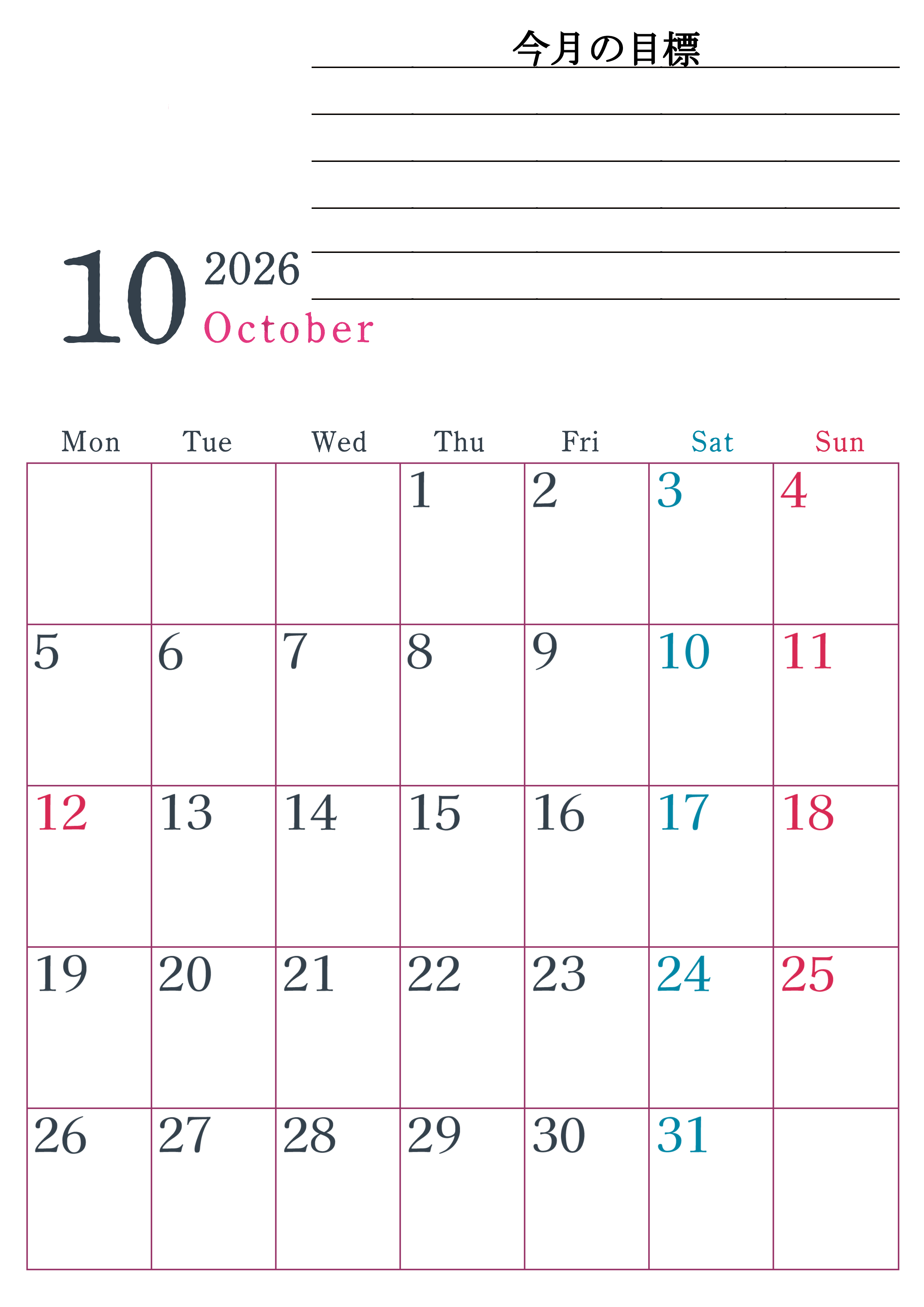 2026年10月カレンダーは縦型月曜始まりで目標設定欄あり♪習慣の継続につながる無料素材(A4)(2026-01561011)