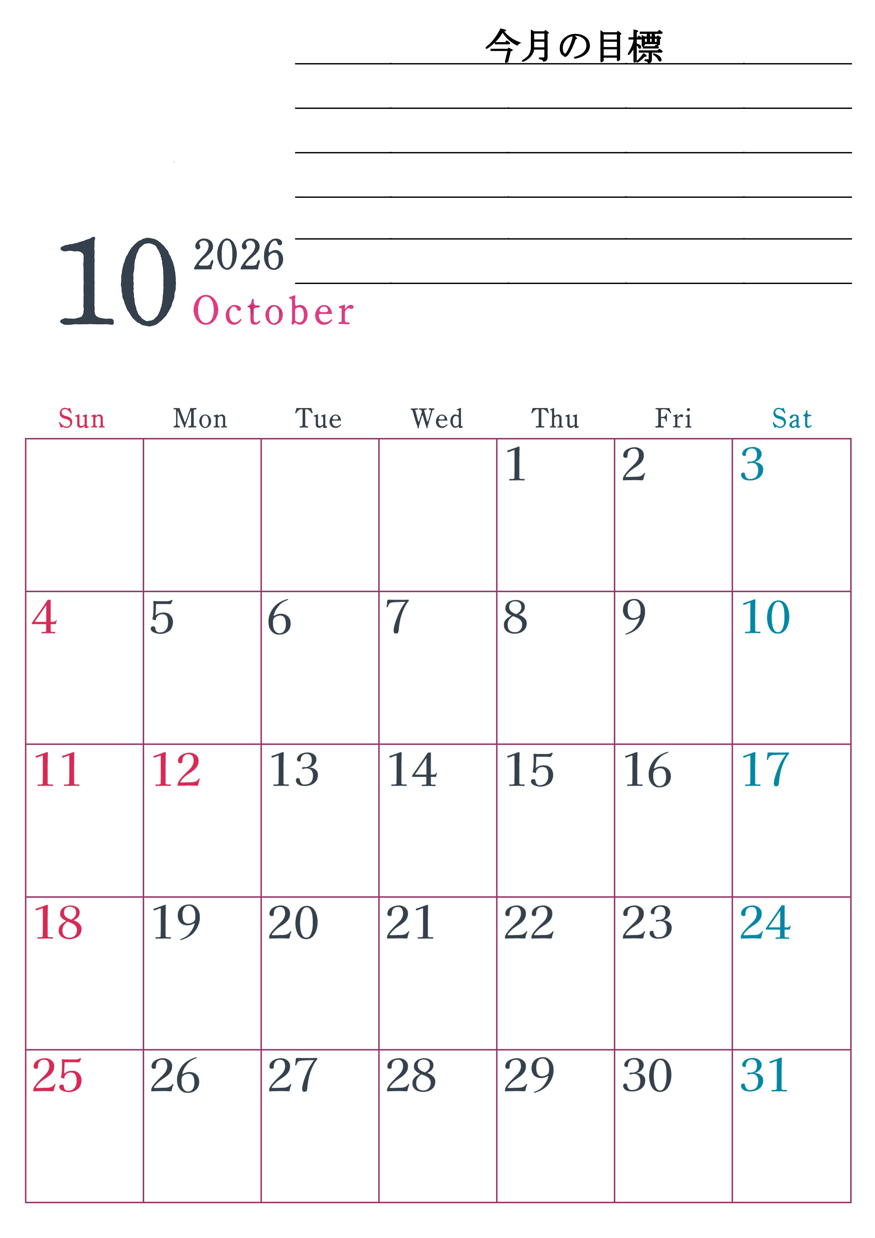 2026年10月カレンダーは縦型日曜始まりで目標設定欄があります。習慣の継続につながる無料の素材なのでダウンロードを気軽に行えます。A4用紙に印刷をして計画を書き込みましょう。(2026-01561010)