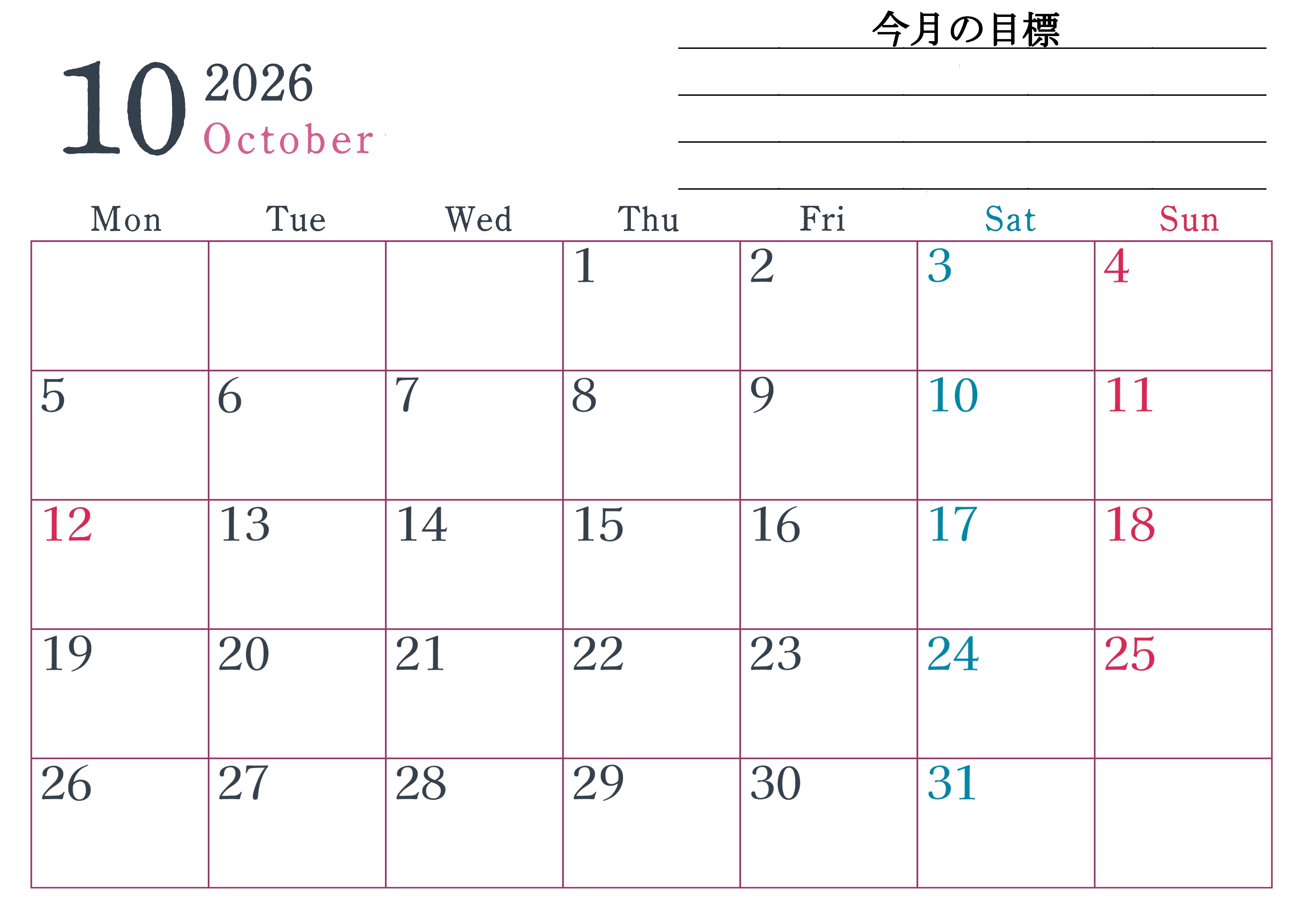2026年・無料のカレンダーテンプレート 2026年10月カレンダーは横型月曜始まりで目標設定欄あり♪習慣の継続につながる無料素材(A4)(2026-01561001) 素材状デザイン王 2025年4月13日 2026年10月カレンダーは横型月曜始まりで目標設定欄があります。習慣の継続につながる無料の素材なのでダウンロードを気軽に行えます。A4用紙に印刷をして計画を書き込みましょう。(2026-01561001) 10月 横型のカレンダー 月曜始まり 目標 カレンダーデザイン-0156