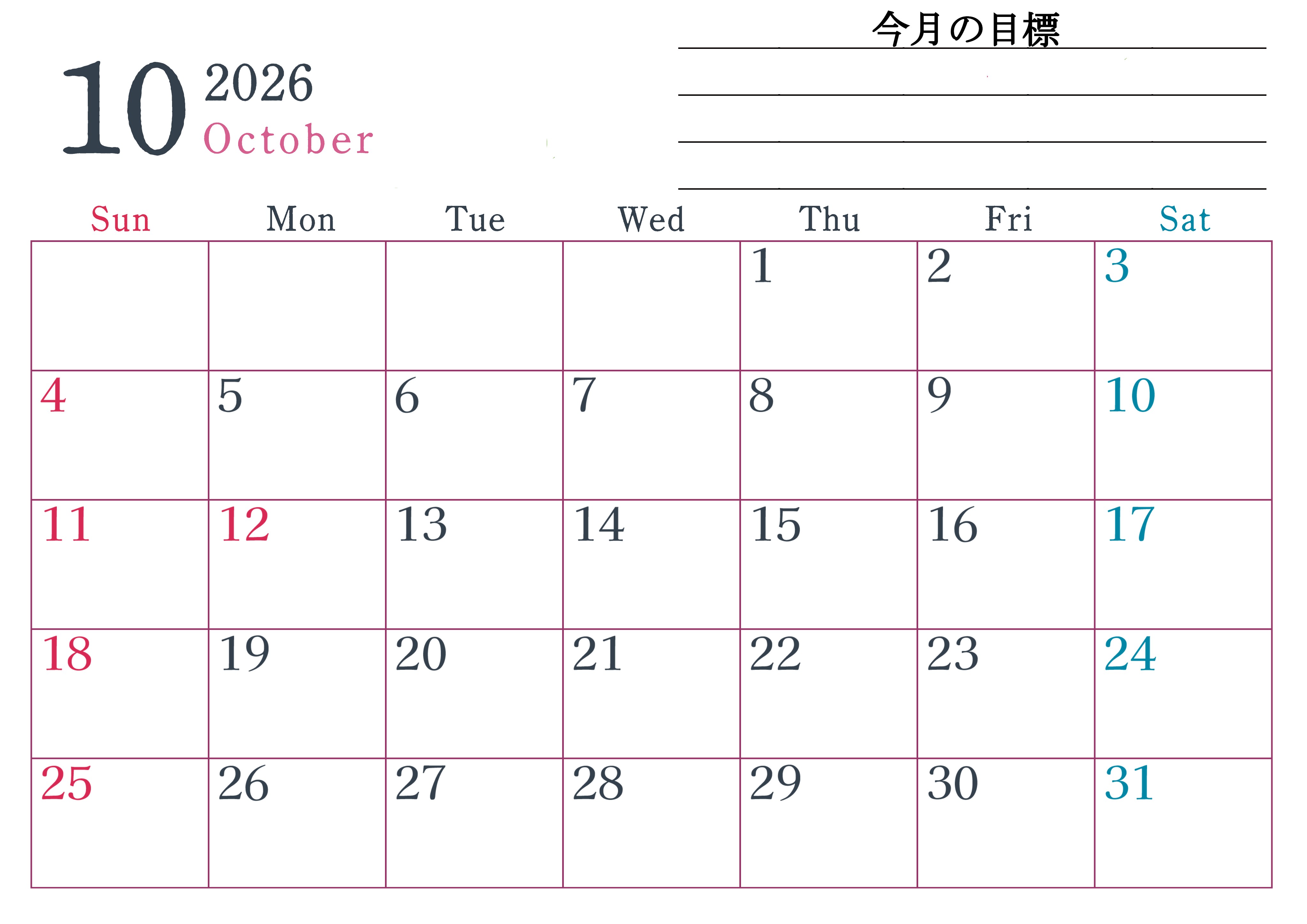 2026年・無料のカレンダーテンプレート 2026年10月カレンダーは横型日曜始まりで目標設定欄あり♪習慣の継続につながる無料素材(A4)(2026-01561000) 素材状デザイン王 2025年4月13日 2026年10月カレンダーは横型日曜始まりで目標設定欄があります。習慣の継続につながる無料の素材なのでダウンロードを気軽に行えます。A4用紙に印刷をして計画を書き込みましょう。(2026-01561000) 10月 横型のカレンダー 日曜始まり 目標 カレンダーデザイン-0156