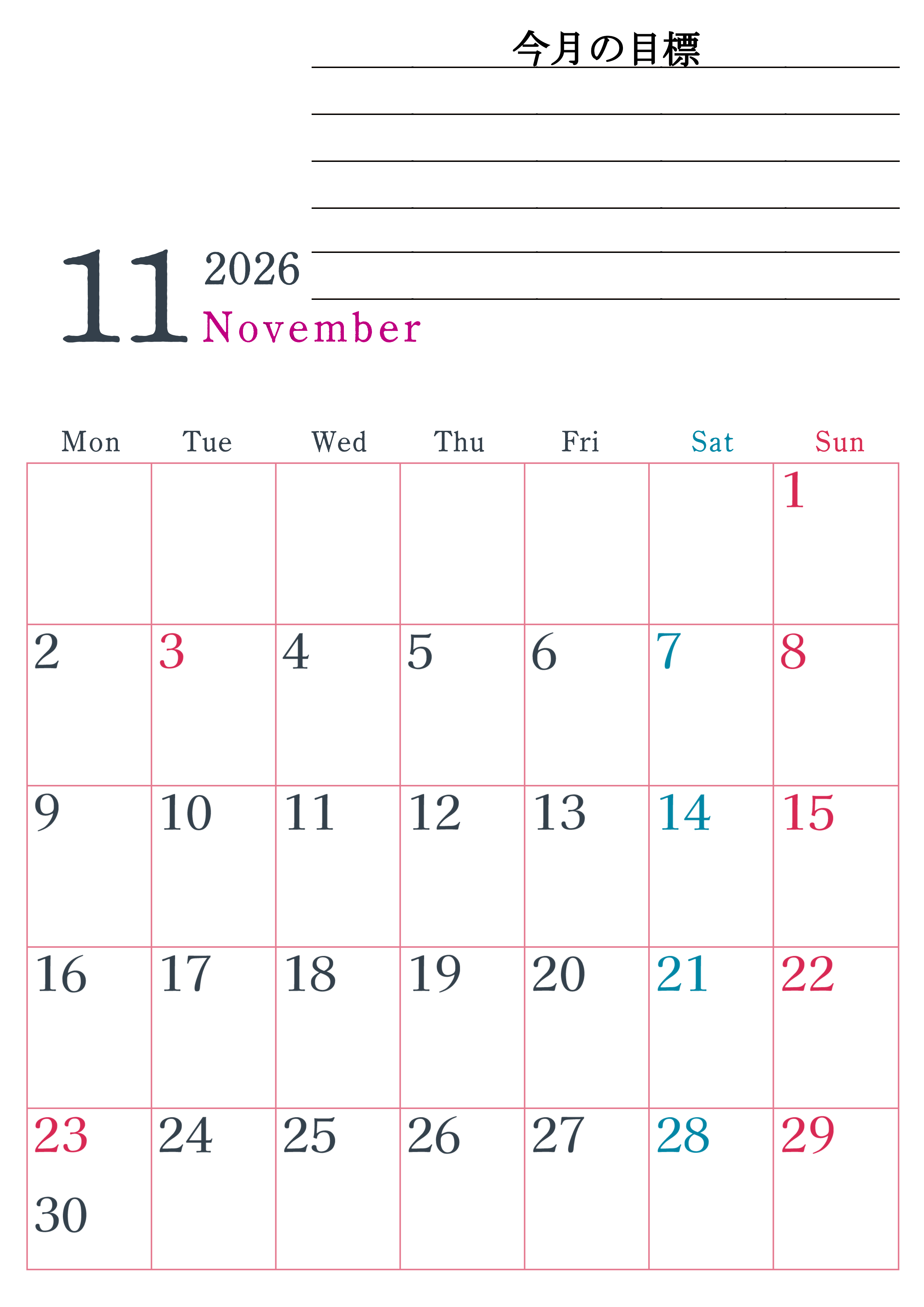 2026年11月カレンダーは縦型月曜始まりで目標設定欄があります。習慣の継続につながる無料の素材なのでダウンロードを気軽に行えます。A4用紙に印刷をして計画を書き込みましょう。(2026-01561111)