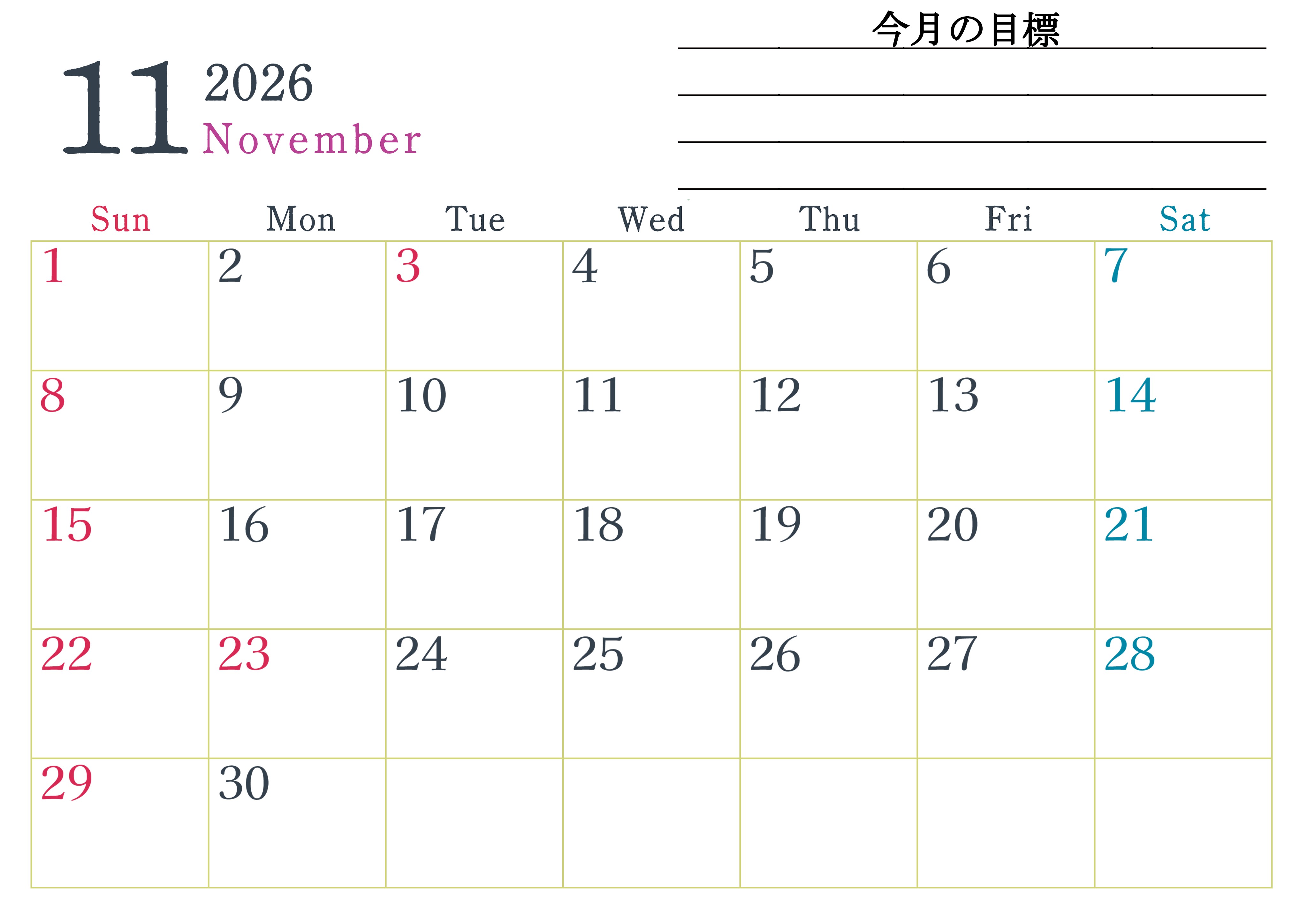 2026年11月カレンダーは横型日曜始まりで目標設定欄があります。習慣の継続につながる無料の素材なのでダウンロードを気軽に行えます。A4用紙に印刷をして計画を書き込みましょう。(2026-01561100)