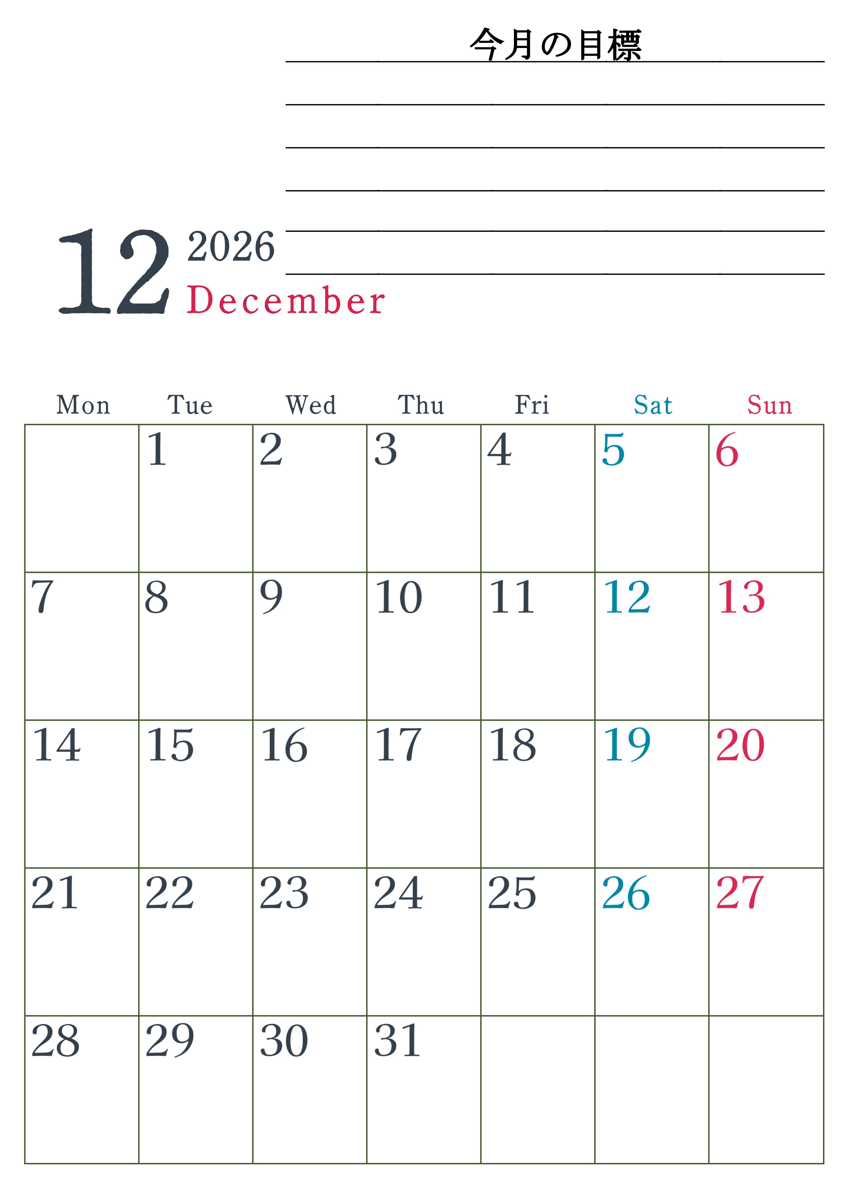 2026年12月カレンダーは縦型月曜始まりで目標設定欄があります。習慣の継続につながる無料の素材なのでダウンロードを気軽に行えます。A4用紙に印刷をして計画を書き込みましょう。(2026-01561211)