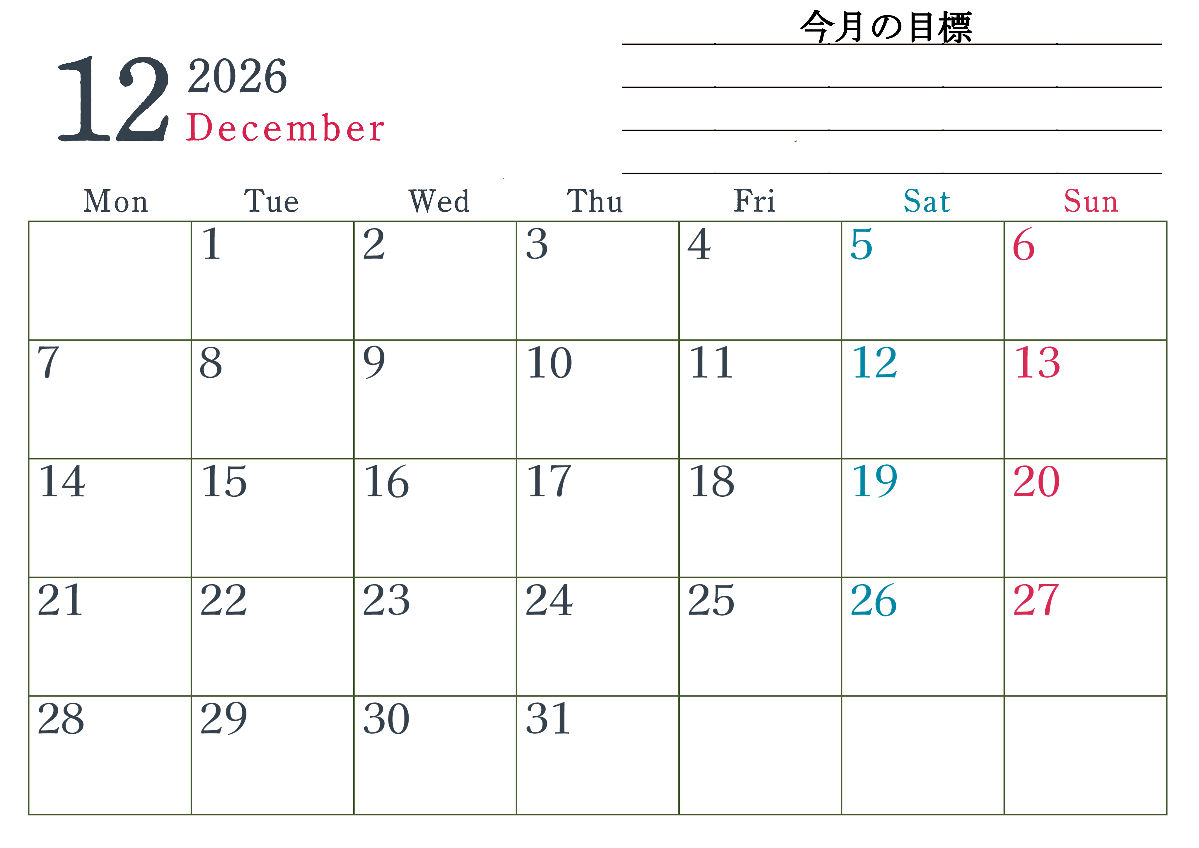 2026年・無料のカレンダーテンプレート 2026年12月カレンダーは横型月曜始まりで目標設定欄あり♪習慣の継続につながる無料素材(A4)(2026-01561201) 素材状デザイン王 2025年4月13日 2026年12月カレンダーは横型月曜始まりで目標設定欄があります。習慣の継続につながる無料の素材なのでダウンロードを気軽に行えます。A4用紙に印刷をして計画を書き込みましょう。(2026-01561201) 12月 横型のカレンダー 月曜始まり 目標 カレンダーデザイン-0156