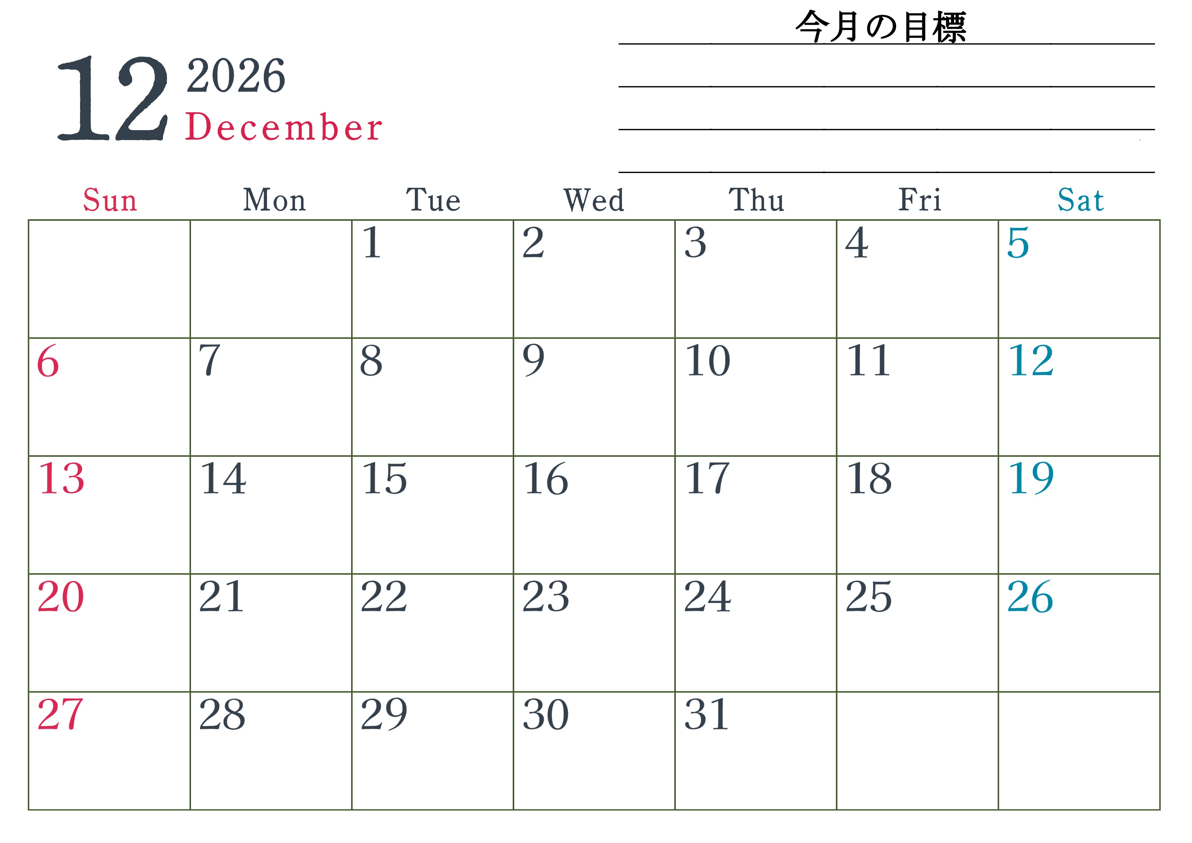 2026年・無料のカレンダーテンプレート 2026年12月カレンダーは横型日曜始まりで目標設定欄あり♪習慣の継続につながる無料素材(A4)(2026-01561200) 素材状デザイン王 2025年4月13日 2026年12月カレンダーは横型日曜始まりで目標設定欄があります。習慣の継続につながる無料の素材なのでダウンロードを気軽に行えます。A4用紙に印刷をして計画を書き込みましょう。(2026-01561200) 12月 横型のカレンダー 日曜始まり 目標 カレンダーデザイン-0156