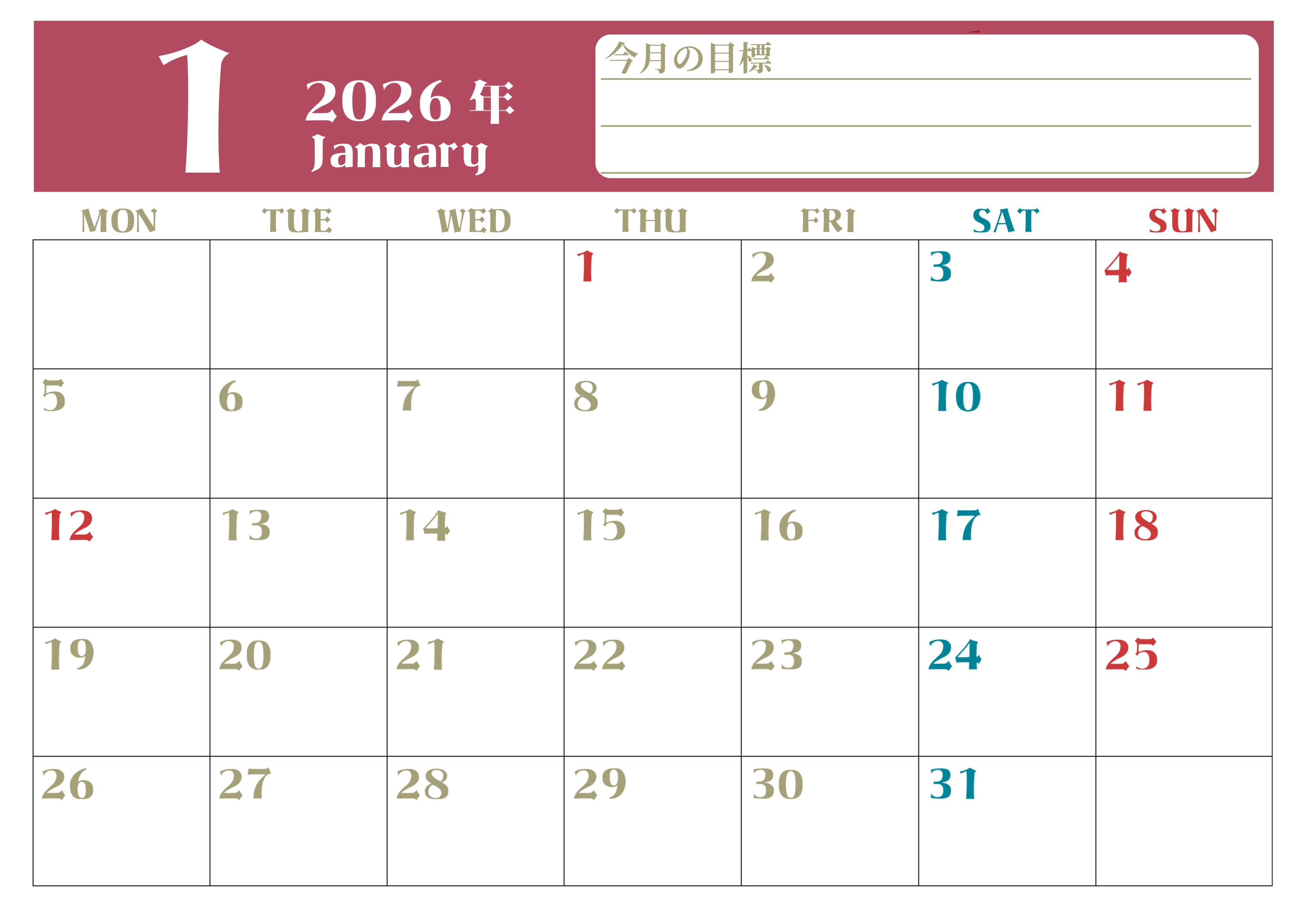 2026年・無料のカレンダーテンプレート 2026年1月カレンダーは横型月曜始まりで目標管理が毎月できる!勉強や自己啓発をしたい人におすすめ!無料(2026-01570101) 素材状デザイン王 2025年4月13日 2026年1月カレンダーは横型月曜始まりのToDoリスト付き無料のフリー素材です。資格や受験勉強の計画におすすめなので自己啓発をしたい方におすすめです。無料ダウンロードすればすぐに印刷ができます。(2026-01570101) 1月 横型のカレンダー 月曜始まり 目標 カレンダーデザイン-0157