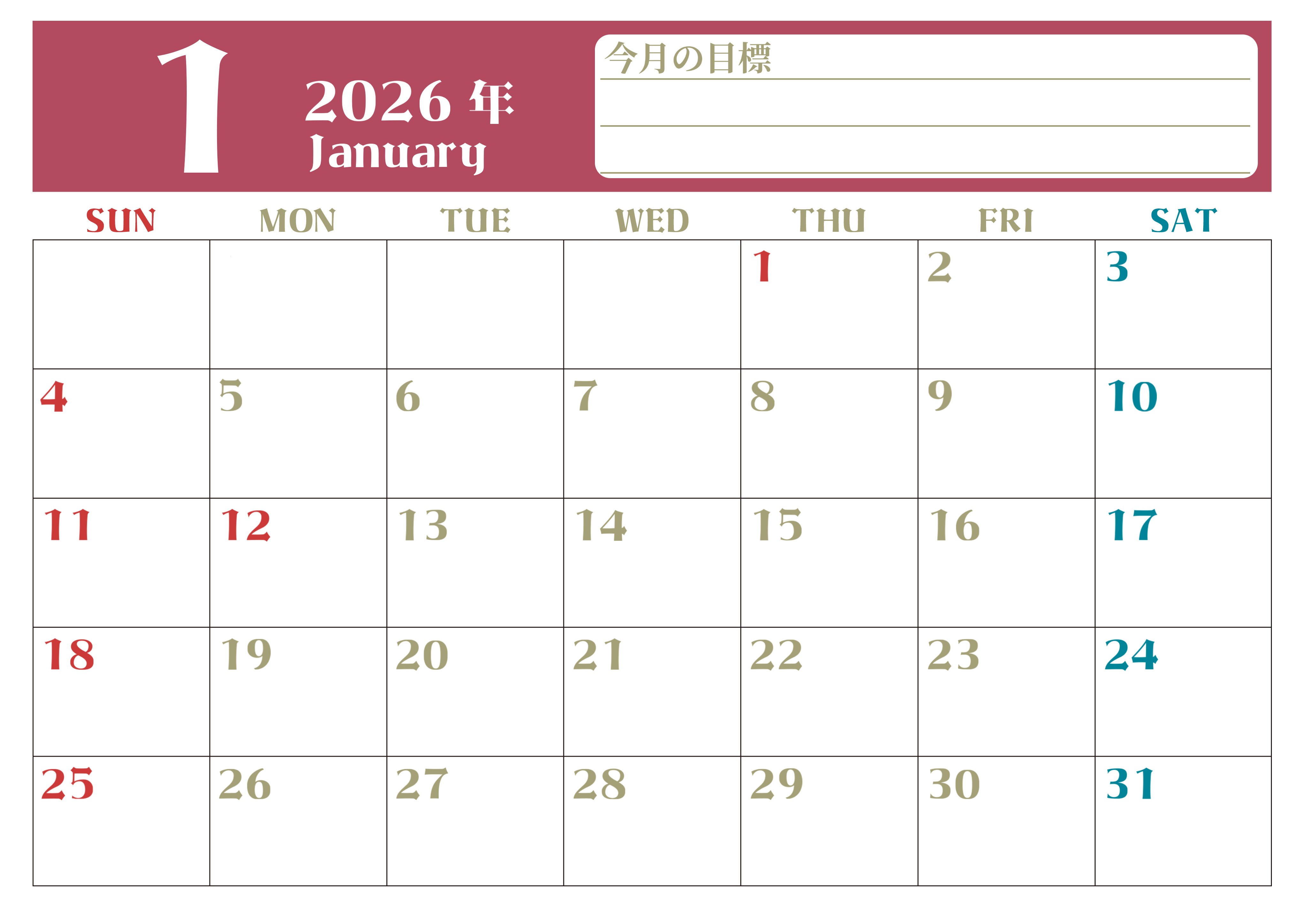 2026年・無料のカレンダーテンプレート 2026年1月カレンダーは横型日曜始まりで目標管理が毎月できる!勉強や自己啓発をしたい人におすすめ!無料(2026-01570100) 素材状デザイン王 2025年4月13日 2026年1月カレンダーは横型日曜始まりのToDoリスト付き無料のフリー素材です。資格や受験勉強の計画におすすめなので自己啓発をしたい方におすすめです。無料ダウンロードすればすぐに印刷ができます。(2026-01570100) 1月 横型のカレンダー 日曜始まり 目標 カレンダーデザイン-0157