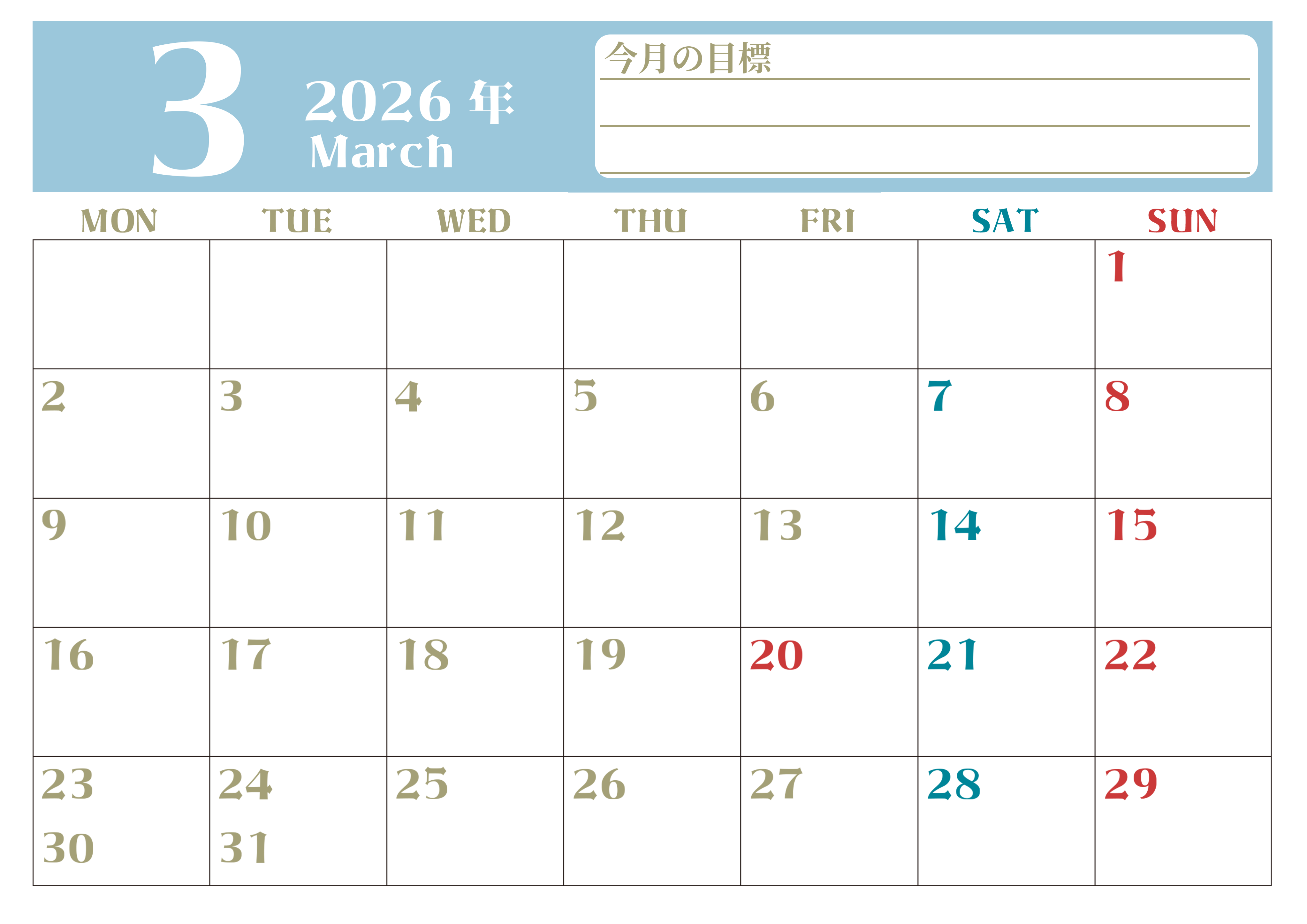 2026年・無料のカレンダーテンプレート 2026年3月カレンダーは横型月曜始まりで目標管理が毎月できる!勉強や自己啓発をしたい人におすすめ!無料(2026-01570301) 素材状デザイン王 2025年4月13日 2026年3月カレンダーは横型月曜始まりのToDoリスト付き無料のフリー素材です。資格や受験勉強の計画におすすめなので自己啓発をしたい方におすすめです。無料ダウンロードすればすぐに印刷ができます。(2026-01570301) 3月 横型のカレンダー 月曜始まり 目標 カレンダーデザイン-0157