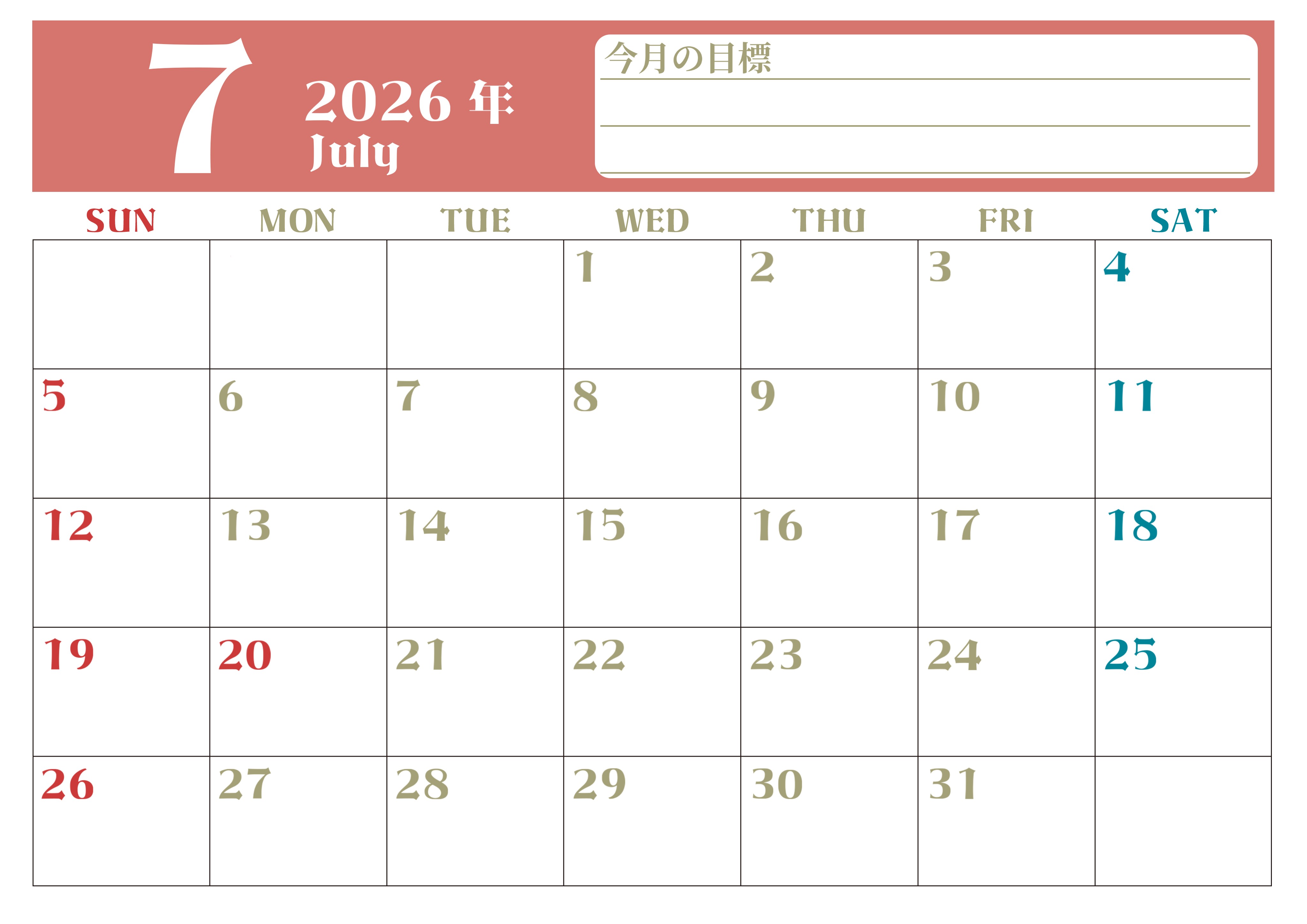 2026年・無料のカレンダーテンプレート 2026年7月カレンダーは横型日曜始まりで目標管理が毎月できる!勉強や自己啓発をしたい人におすすめ!無料(2026-01570700) 素材状デザイン王 2025年4月13日 2026年7月カレンダーは横型日曜始まりのToDoリスト付き無料のフリー素材です。資格や受験勉強の計画におすすめなので自己啓発をしたい方におすすめです。無料ダウンロードすればすぐに印刷ができます。(2026-01570700) 7月 横型のカレンダー 日曜始まり 目標 カレンダーデザイン-0157