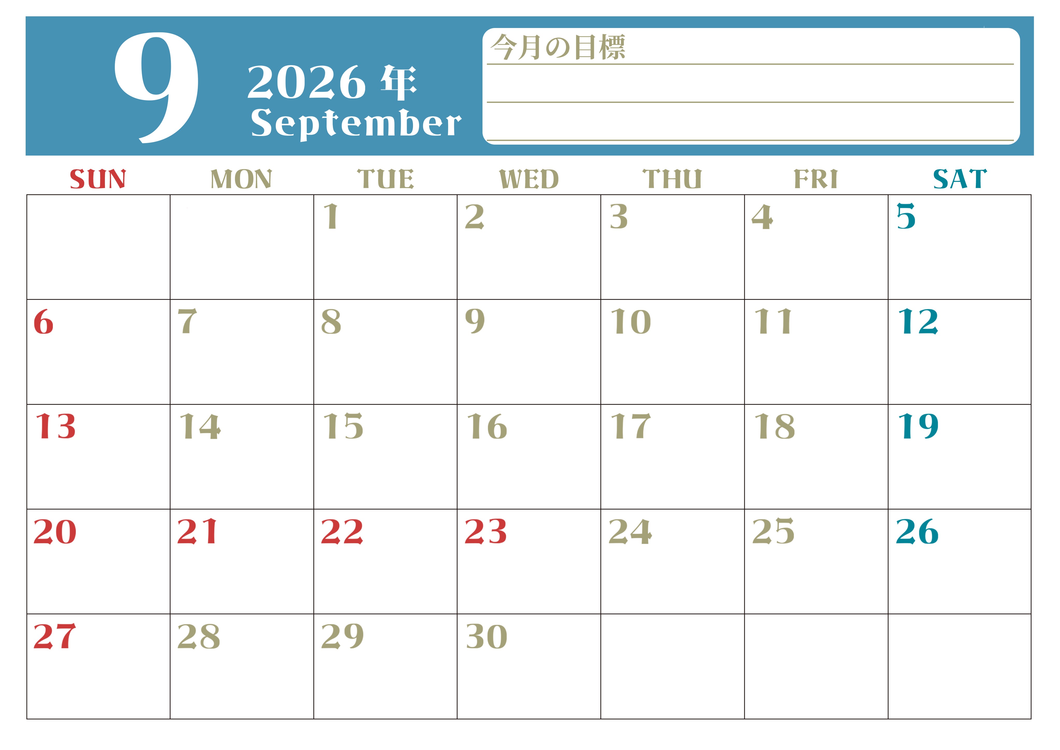 2026年・無料のカレンダーテンプレート 2026年9月カレンダーは横型日曜始まりで目標管理が毎月できる!勉強や自己啓発をしたい人におすすめ!無料(2026-01570900) 素材状デザイン王 2025年4月13日 2026年9月カレンダーは横型日曜始まりのToDoリスト付き無料のフリー素材です。資格や受験勉強の計画におすすめなので自己啓発をしたい方におすすめです。無料ダウンロードすればすぐに印刷ができます。(2026-01570900) 9月 横型のカレンダー 日曜始まり 目標 カレンダーデザイン-0157