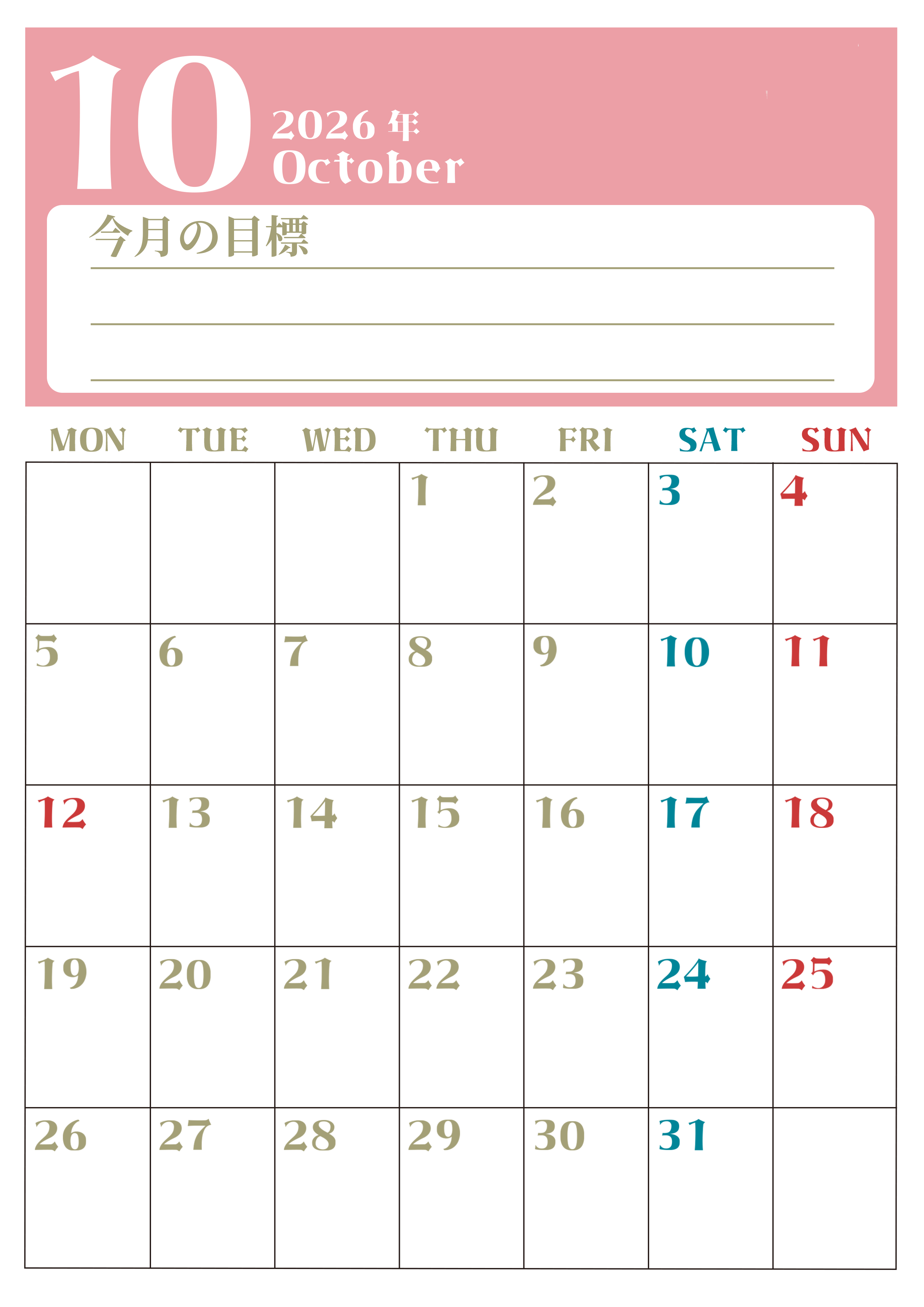 2026年10月カレンダーは縦型月曜始まりで目標管理が毎月できる!勉強や自己啓発をしたい人におすすめ!無料(2026-01571011)