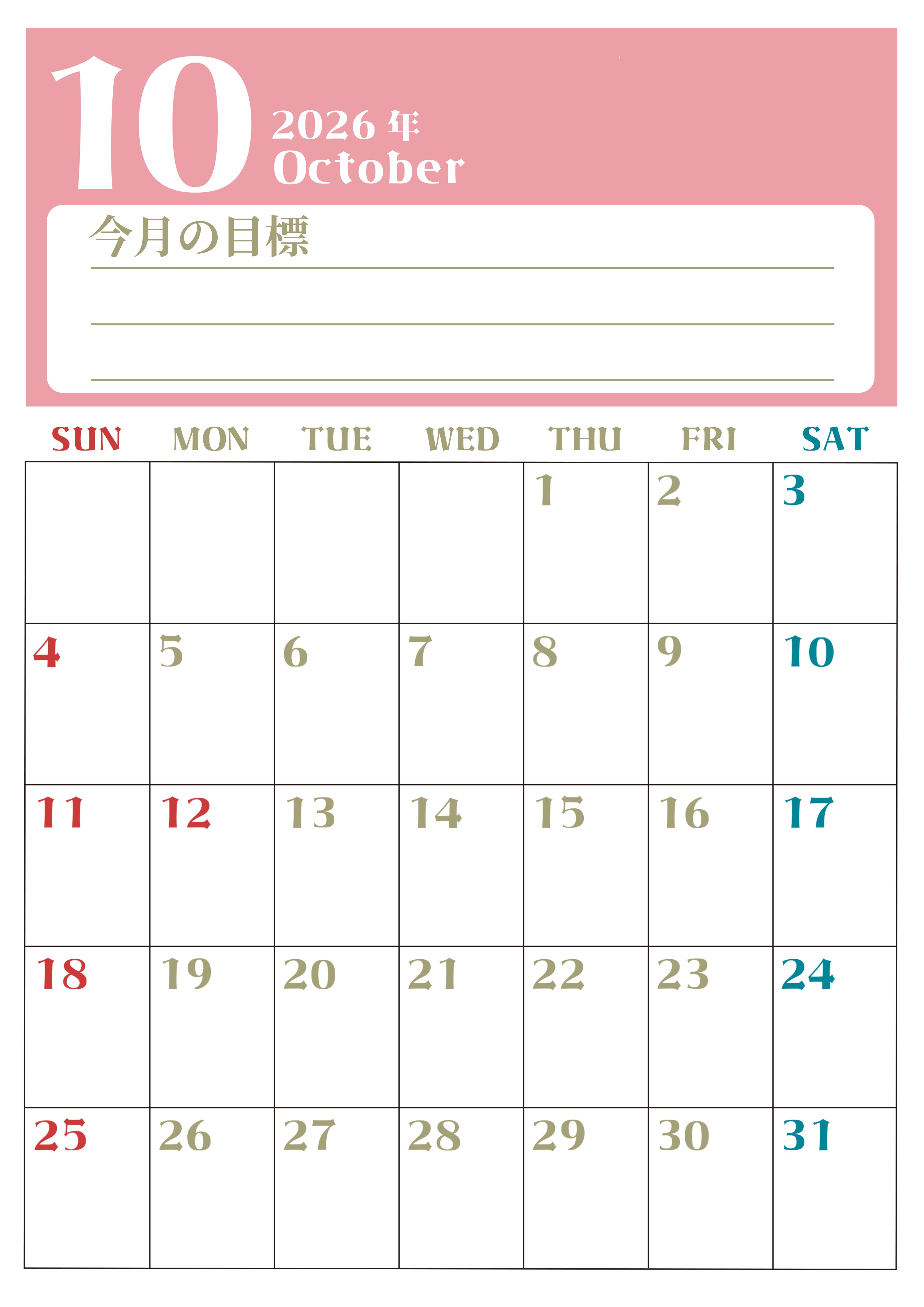 2026年10月カレンダーは縦型日曜始まりのToDoリスト付き無料のフリー素材です。資格や受験勉強の計画におすすめなので自己啓発をしたい方におすすめです。無料ダウンロードすればすぐに印刷ができます。(2026-01571010)