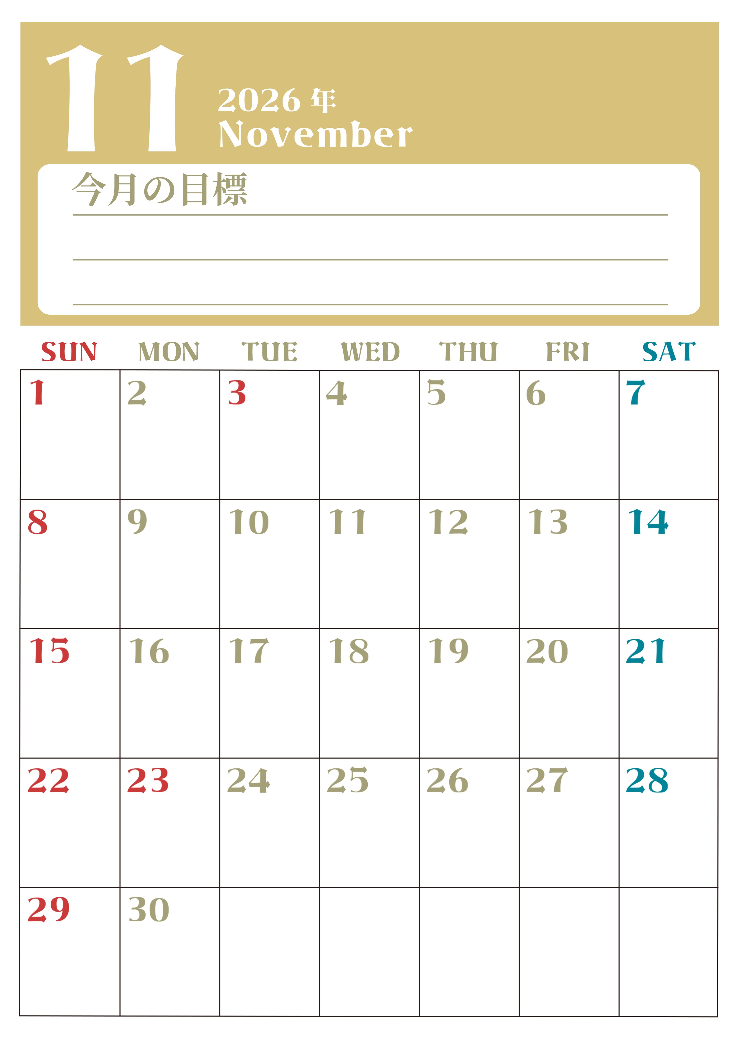 2026年11月カレンダーは縦型日曜始まりのToDoリスト付き無料のフリー素材です。資格や受験勉強の計画におすすめなので自己啓発をしたい方におすすめです。無料ダウンロードすればすぐに印刷ができます。(2026-01571110)