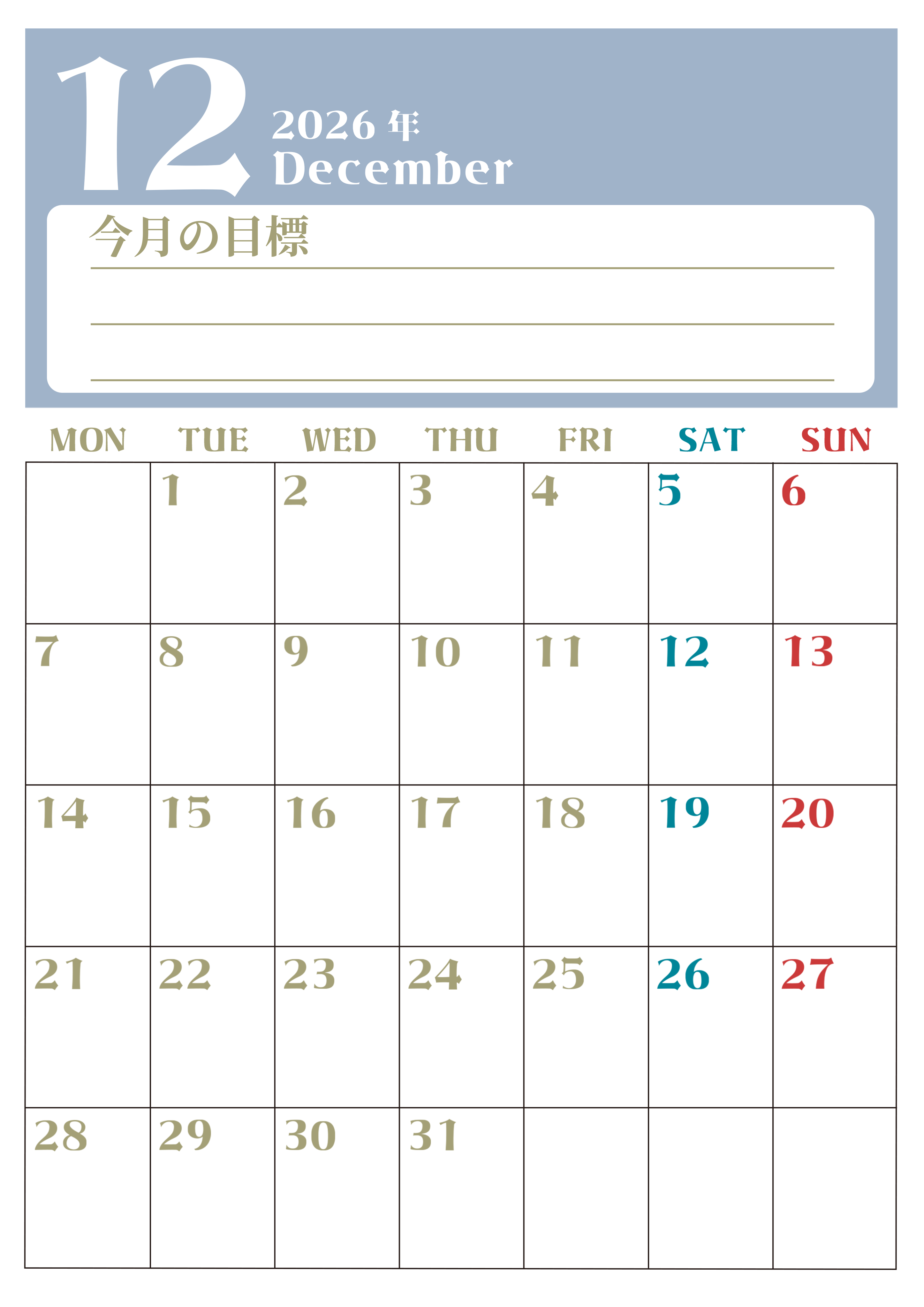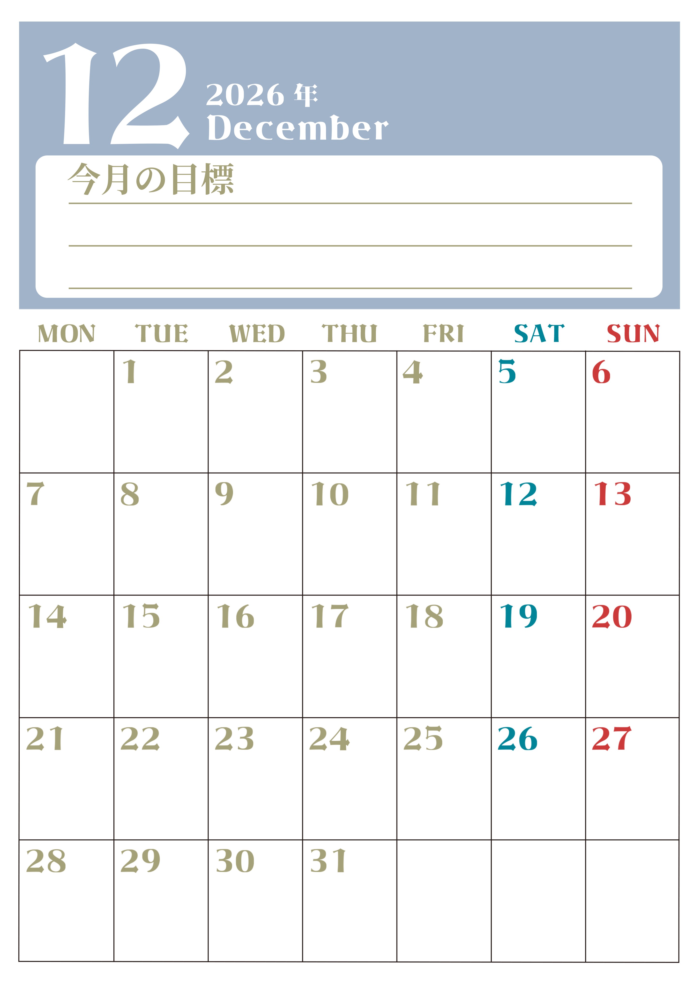 2026年12月カレンダーは縦型月曜始まりのToDoリスト付き無料のフリー素材です。資格や受験勉強の計画におすすめなので自己啓発をしたい方におすすめです。無料ダウンロードすればすぐに印刷ができます。(2026-01571211)