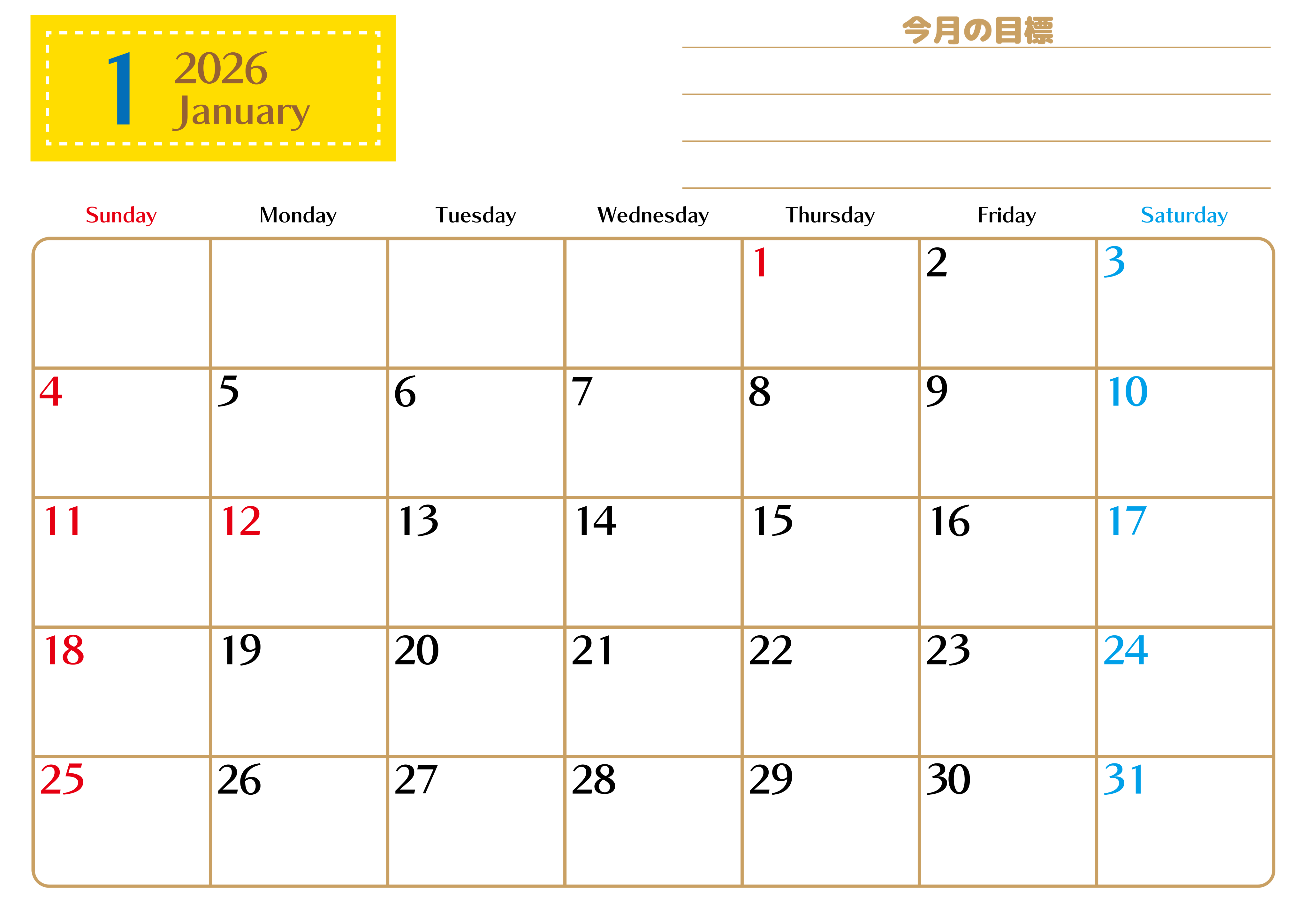 2026年・無料のカレンダーテンプレート 2026年1月カレンダーは横型日曜始まりで使いやすい目標管理シートつき!毎日可視化でモチベUP:無料(2026-01580100) 素材状デザイン王 2025年4月13日 2026年1月カレンダーは横型日曜始まりで使いやすい目標管理シートつきです。毎日、あなたの目標を可視化することでモチベーションをUPしましょう。無料で使いやすいです。(2026-01580100) 1月 横型のカレンダー 日曜始まり 目標 カレンダーデザイン-0158