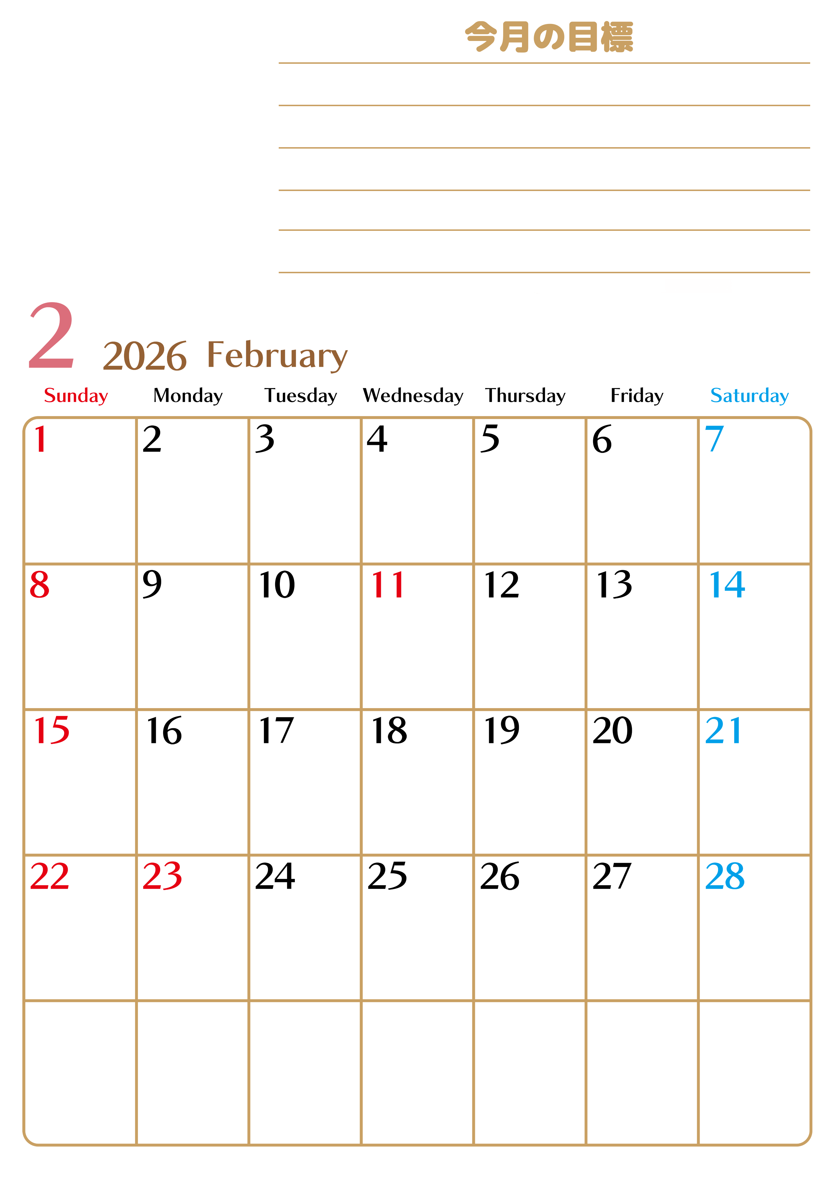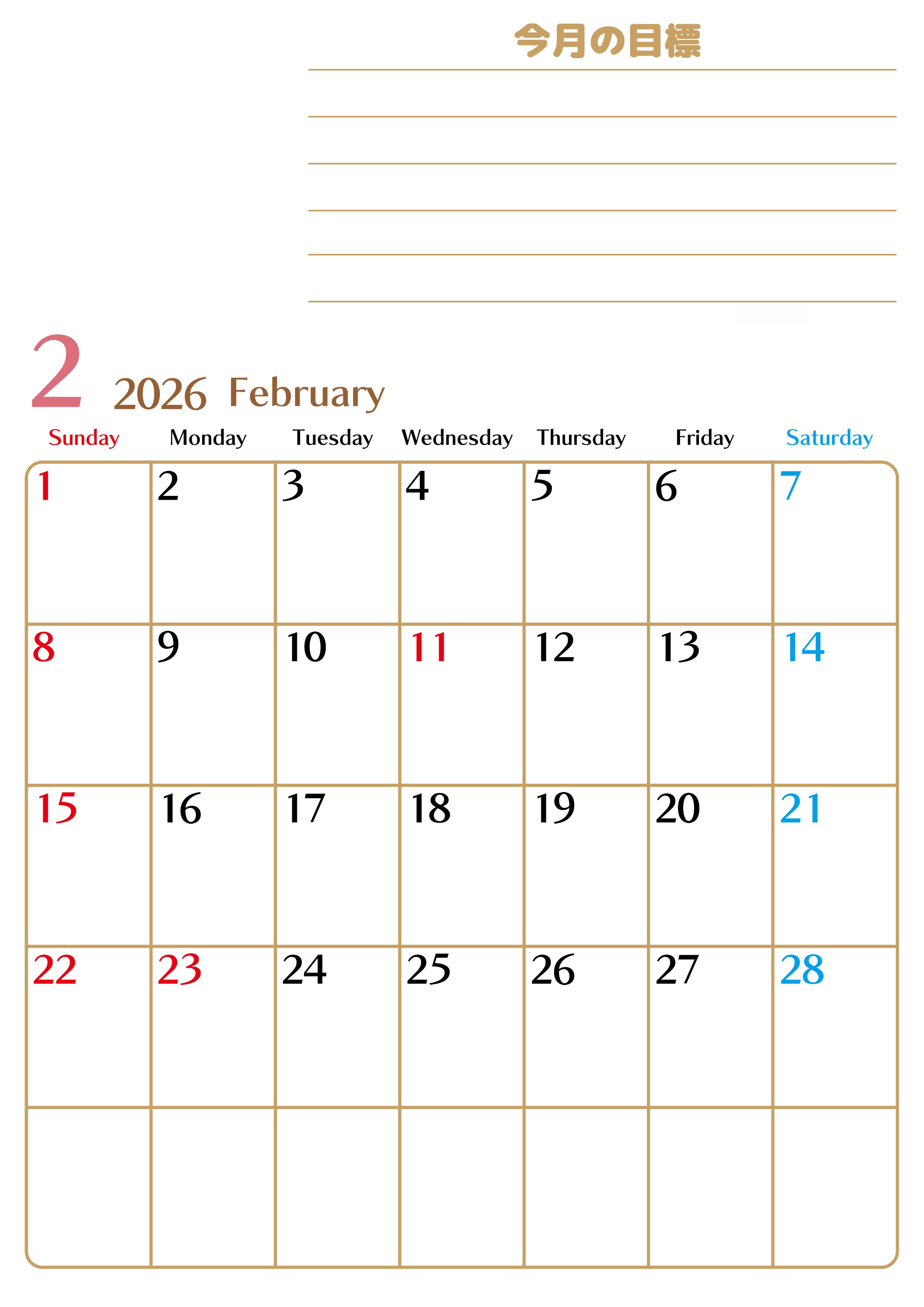 2026年・無料のカレンダーテンプレート 2026年2月カレンダーは縦型日曜始まりで使いやすい目標管理シートつき!毎日可視化でモチベUP:無料(2026-01580210) 素材状デザイン王 2025年4月13日 2026年2月カレンダーは縦型日曜始まりで使いやすい目標管理シートつきです。毎日、あなたの目標を可視化することでモチベーションをUPしましょう。無料で使いやすいです。(2026-01580210) 2月 縦型のカレンダー 日曜始まり 目標 カレンダーデザイン-0158