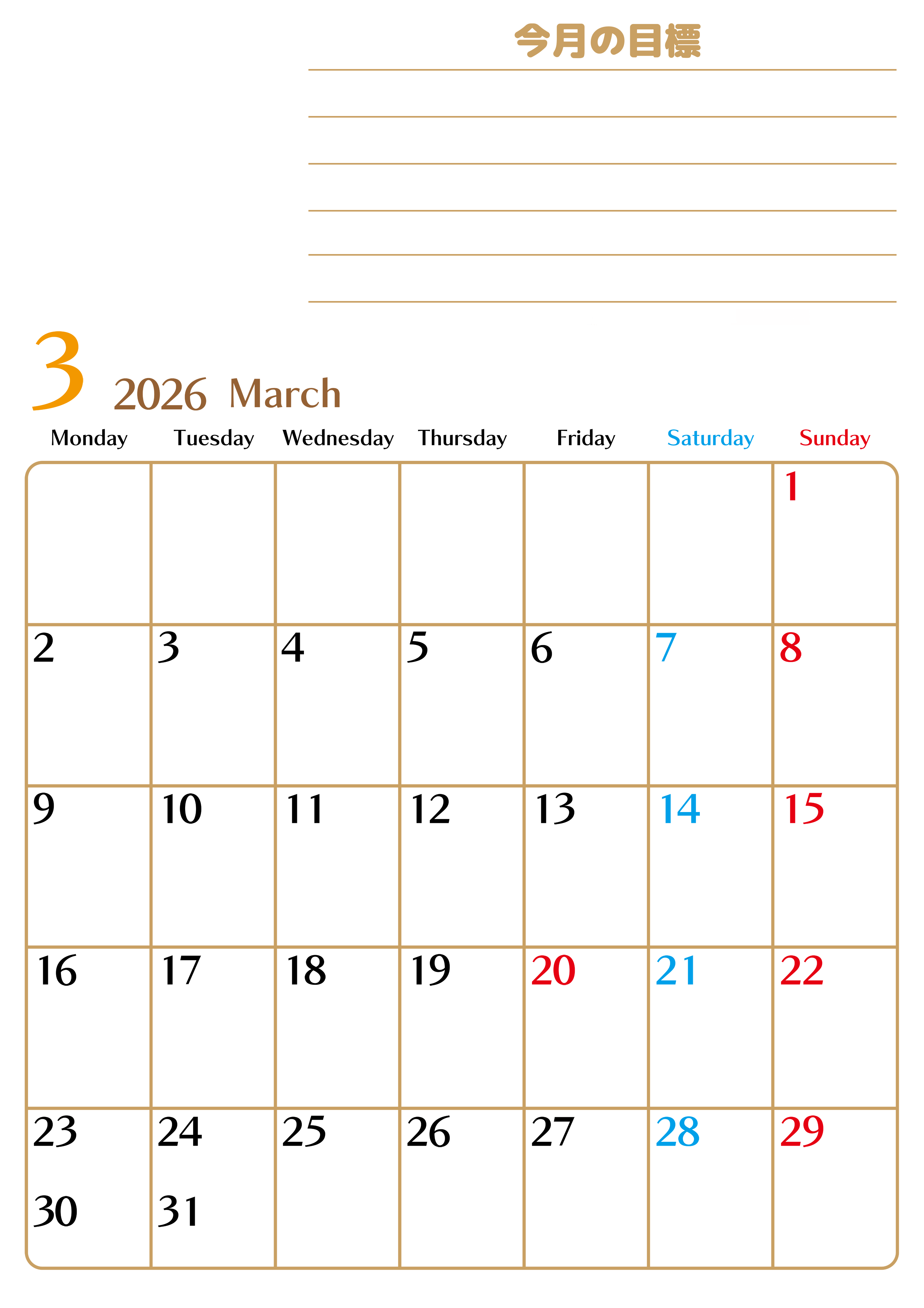 2026年3月カレンダーは縦型月曜始まりで使いやすい目標管理シートつき!毎日可視化でモチベUP:無料(2026-01580311)