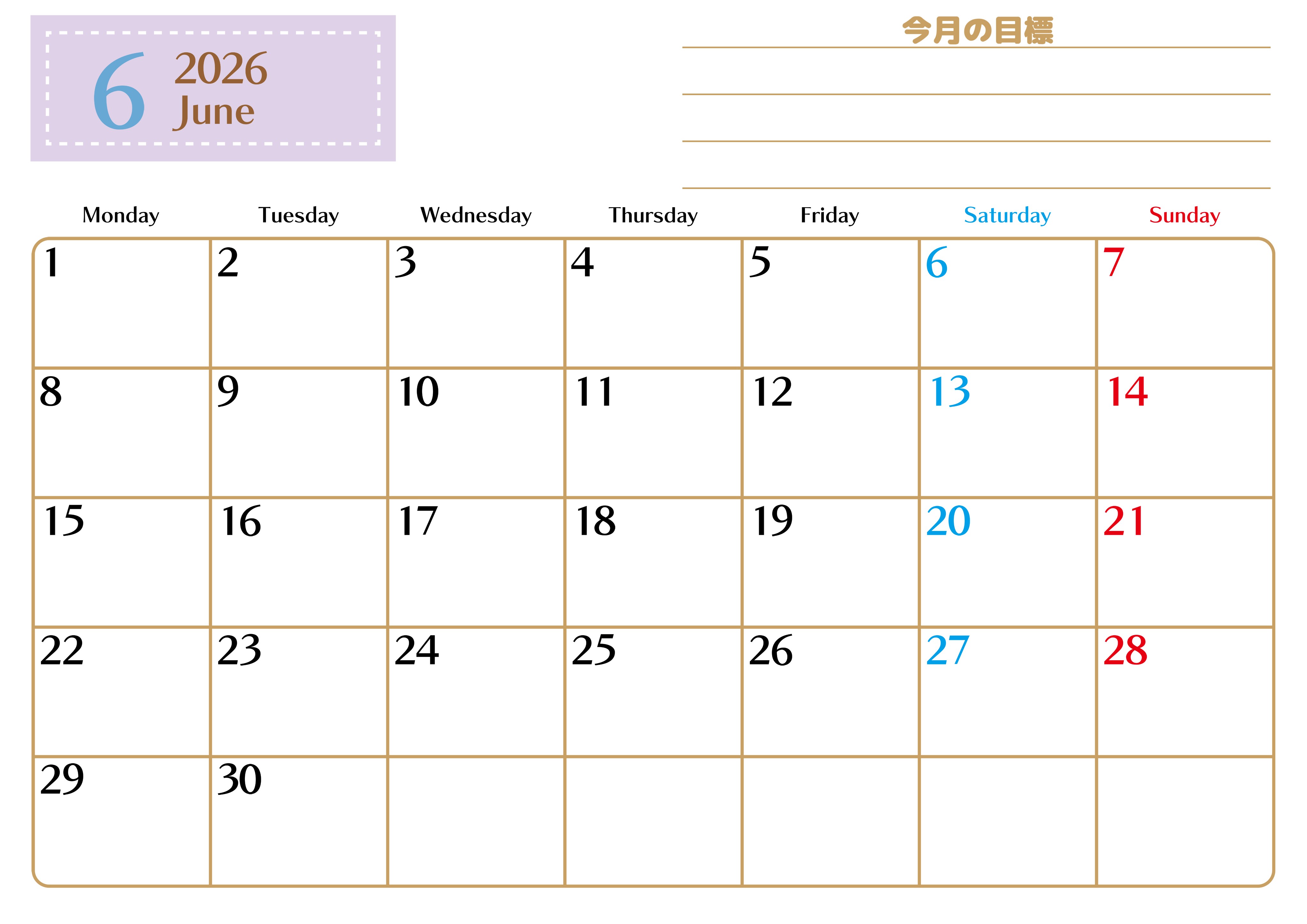 2026年6月カレンダーは横型月曜始まりで使いやすい目標管理シートつきです。毎日、あなたの目標を可視化することでモチベーションをUPしましょう。無料で使いやすいです。(2026-01580601)