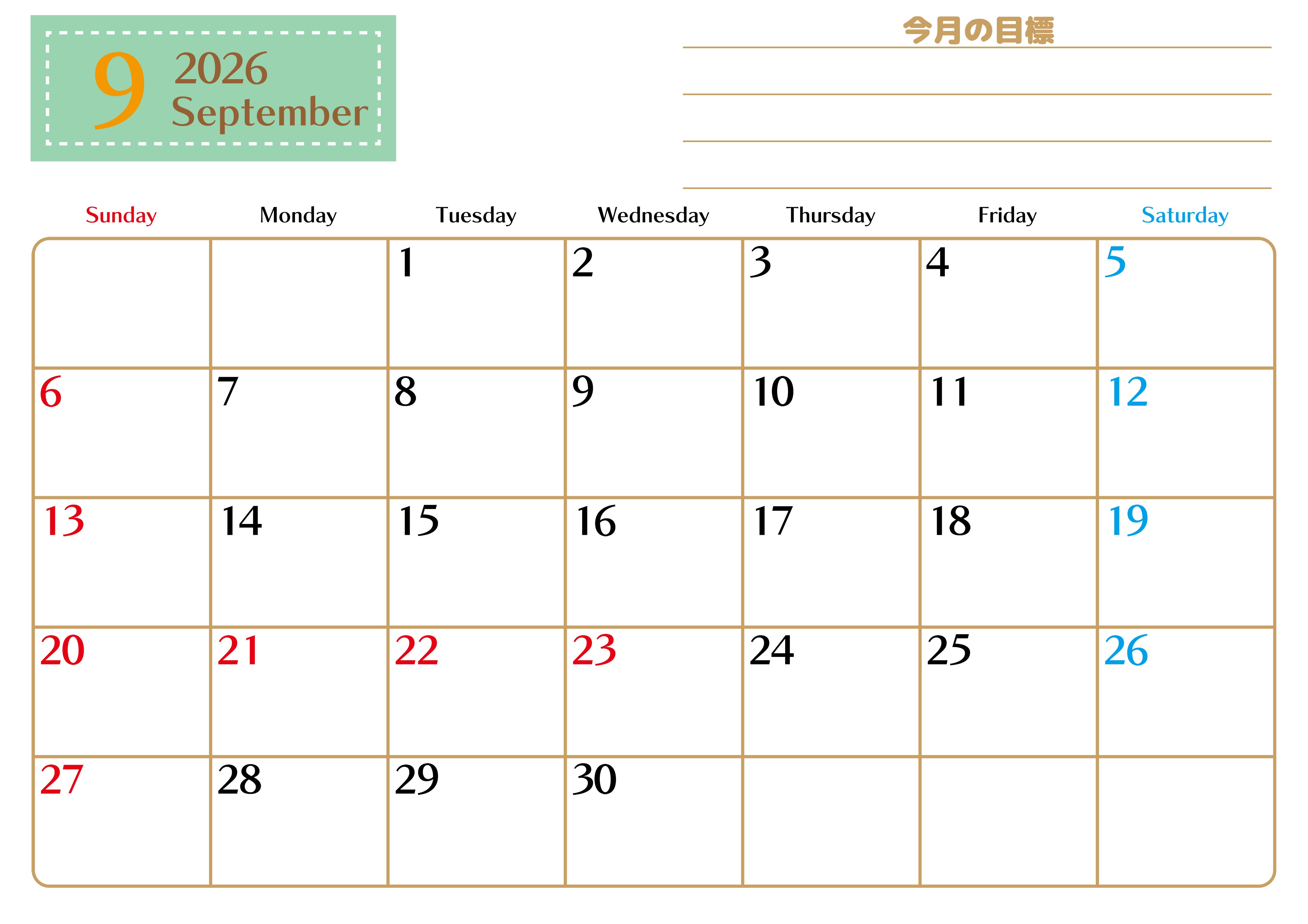 2026年・無料のカレンダーテンプレート 2026年9月カレンダーは横型日曜始まりで使いやすい目標管理シートつき!毎日可視化でモチベUP:無料(2026-01580900) 素材状デザイン王 2025年4月13日 2026年9月カレンダーは横型日曜始まりで使いやすい目標管理シートつきです。毎日、あなたの目標を可視化することでモチベーションをUPしましょう。無料で使いやすいです。(2026-01580900) 9月 横型のカレンダー 日曜始まり 目標 カレンダーデザイン-0158