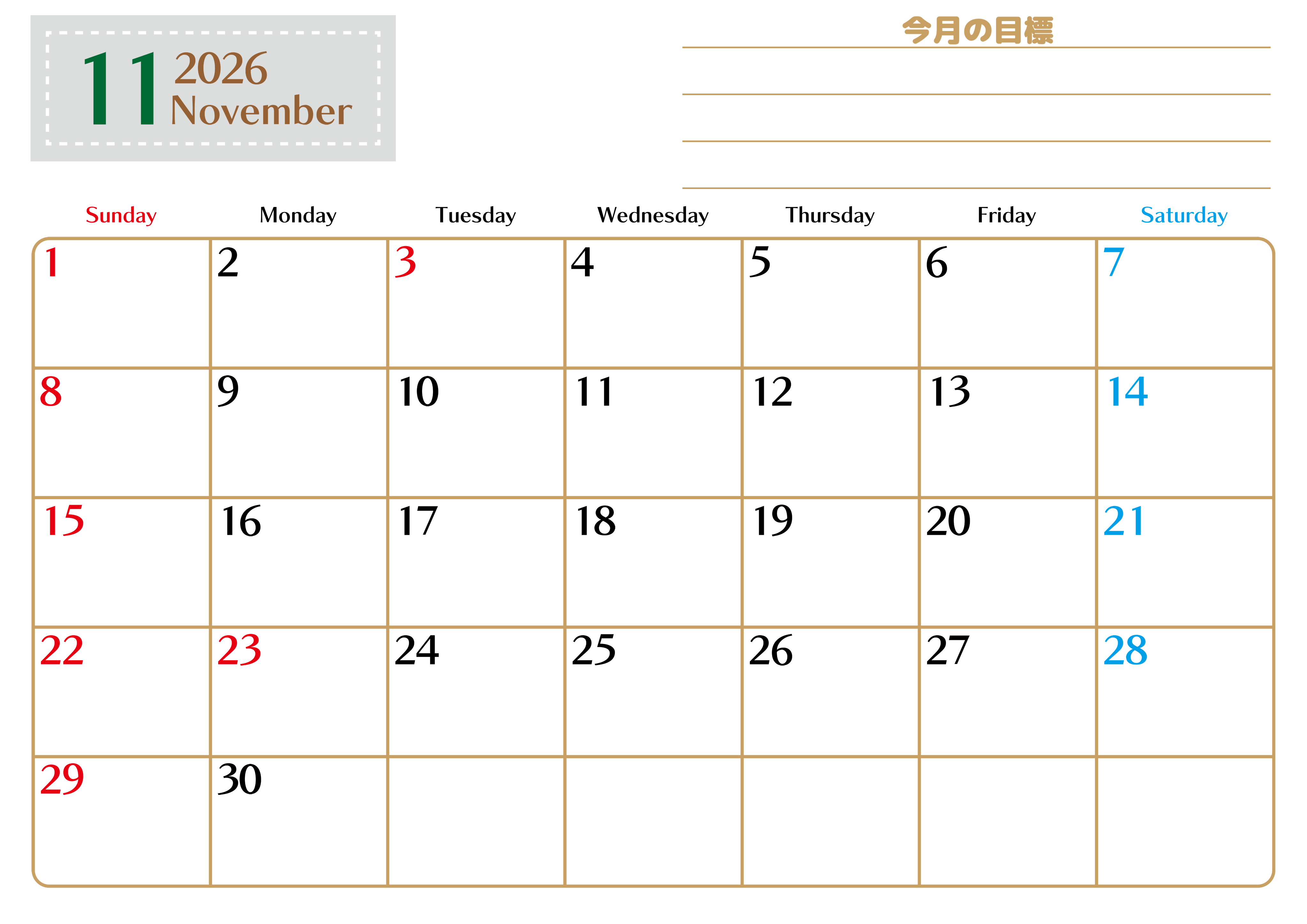 2026年11月カレンダーは横型日曜始まりで使いやすい目標管理シートつきです。毎日、あなたの目標を可視化することでモチベーションをUPしましょう。無料で使いやすいです。(2026-01581100)