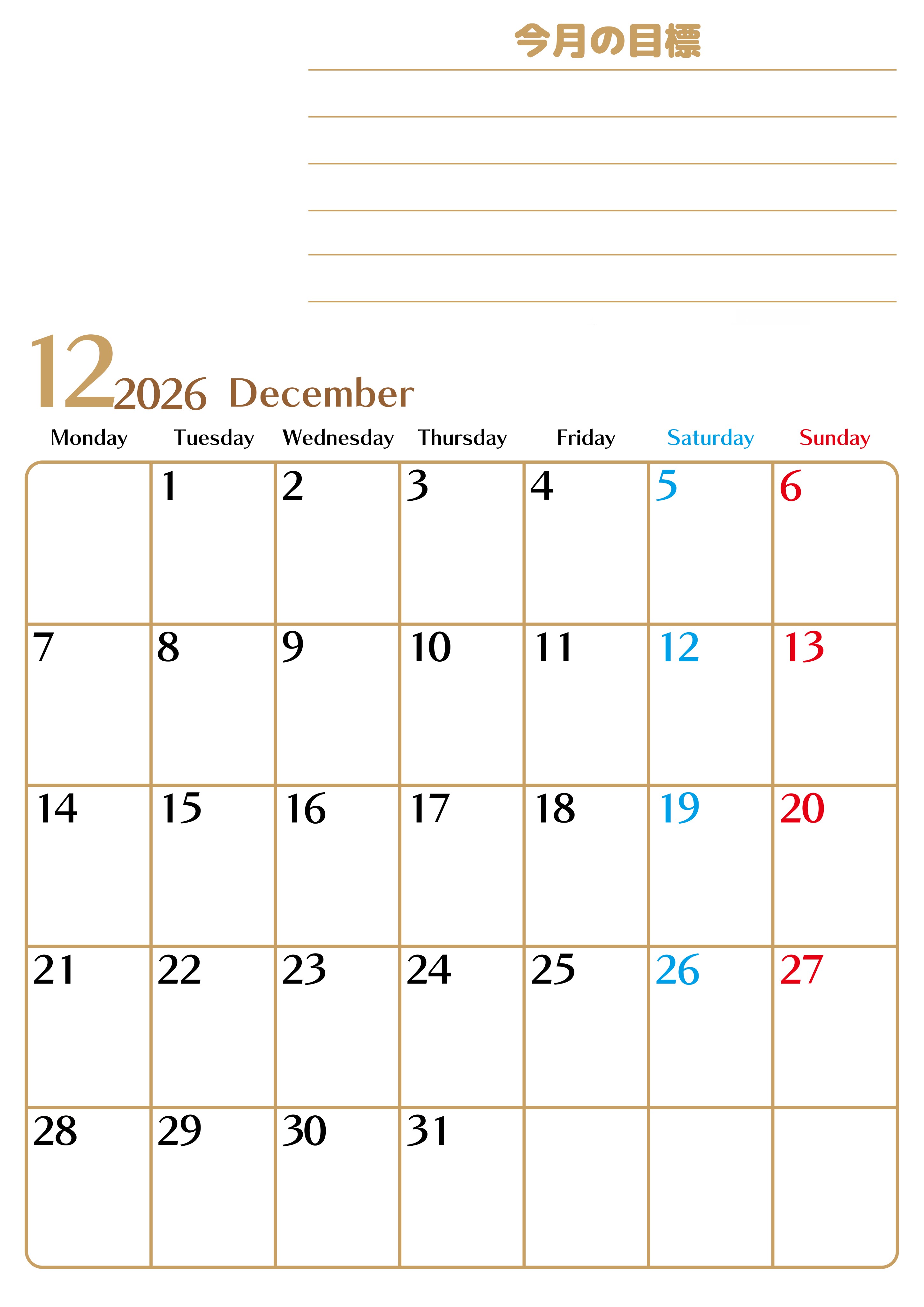 2026年12月カレンダーは縦型月曜始まりで使いやすい目標管理シートつきです。毎日、あなたの目標を可視化することでモチベーションをUPしましょう。無料で使いやすいです。(2026-01581211)