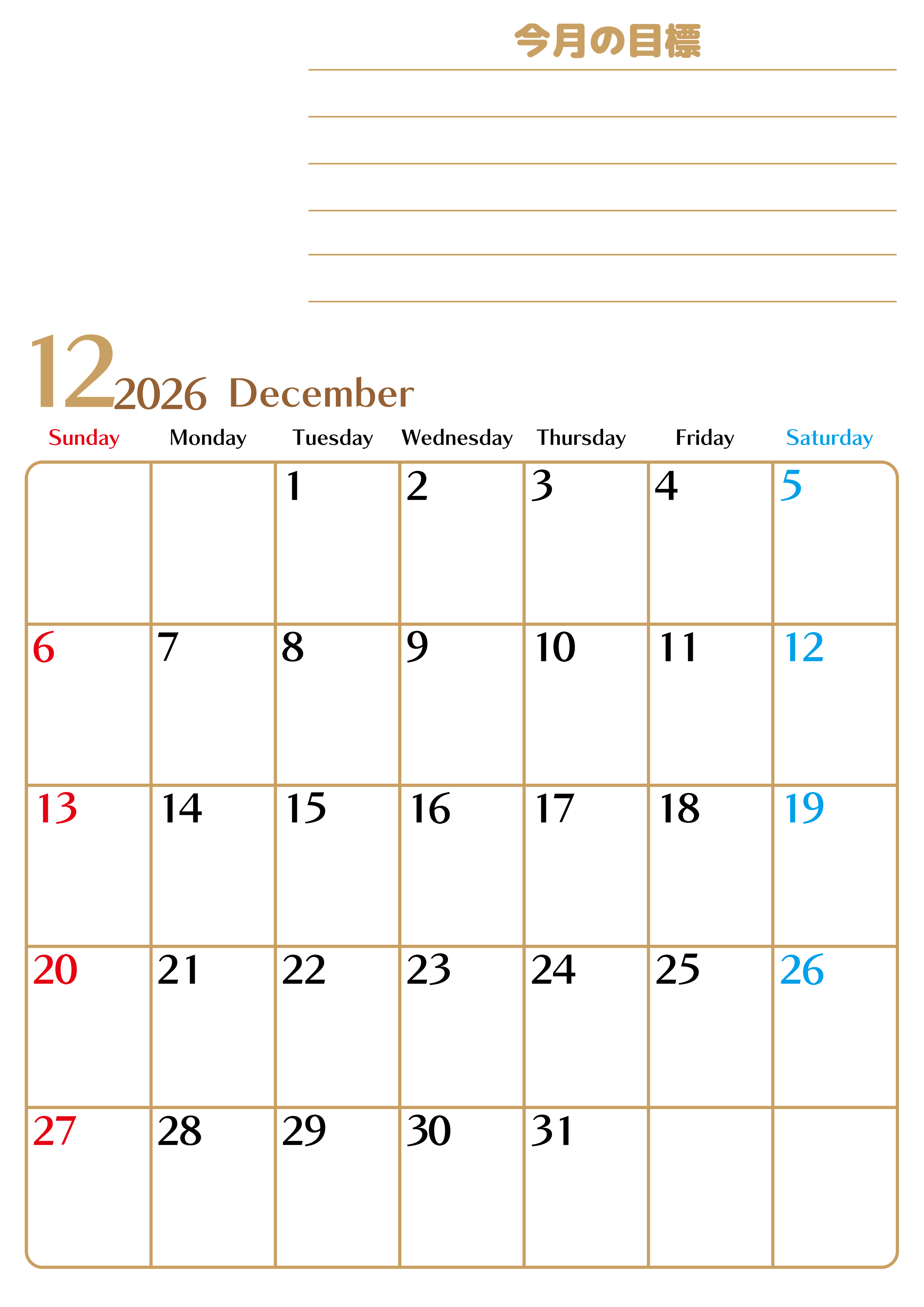 2026年12月カレンダーは縦型日曜始まりで使いやすい目標管理シートつきです。毎日、あなたの目標を可視化することでモチベーションをUPしましょう。無料で使いやすいです。(2026-01581210)
