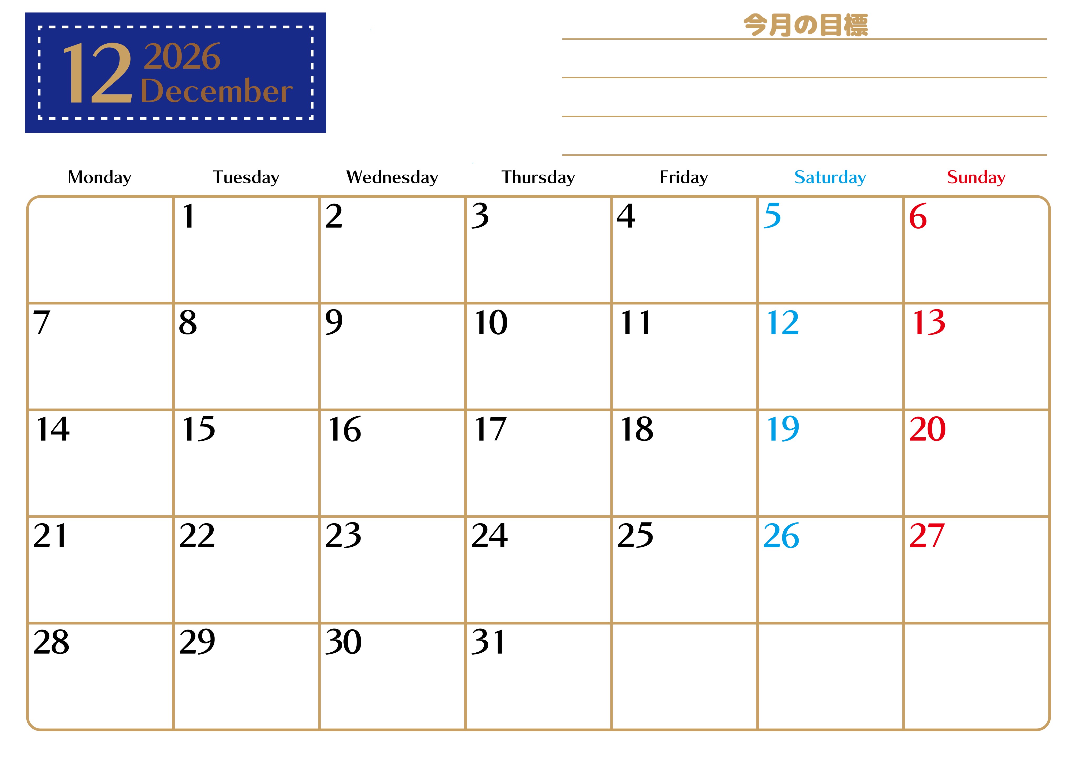 2026年・無料のカレンダーテンプレート 2026年12月カレンダーは横型月曜始まりで使いやすい目標管理シートつき!毎日可視化でモチベUP:無料(2026-01581201) 素材状デザイン王 2025年4月13日 2026年12月カレンダーは横型月曜始まりで使いやすい目標管理シートつきです。毎日、あなたの目標を可視化することでモチベーションをUPしましょう。無料で使いやすいです。(2026-01581201) 12月 横型のカレンダー 月曜始まり 目標 カレンダーデザイン-0158