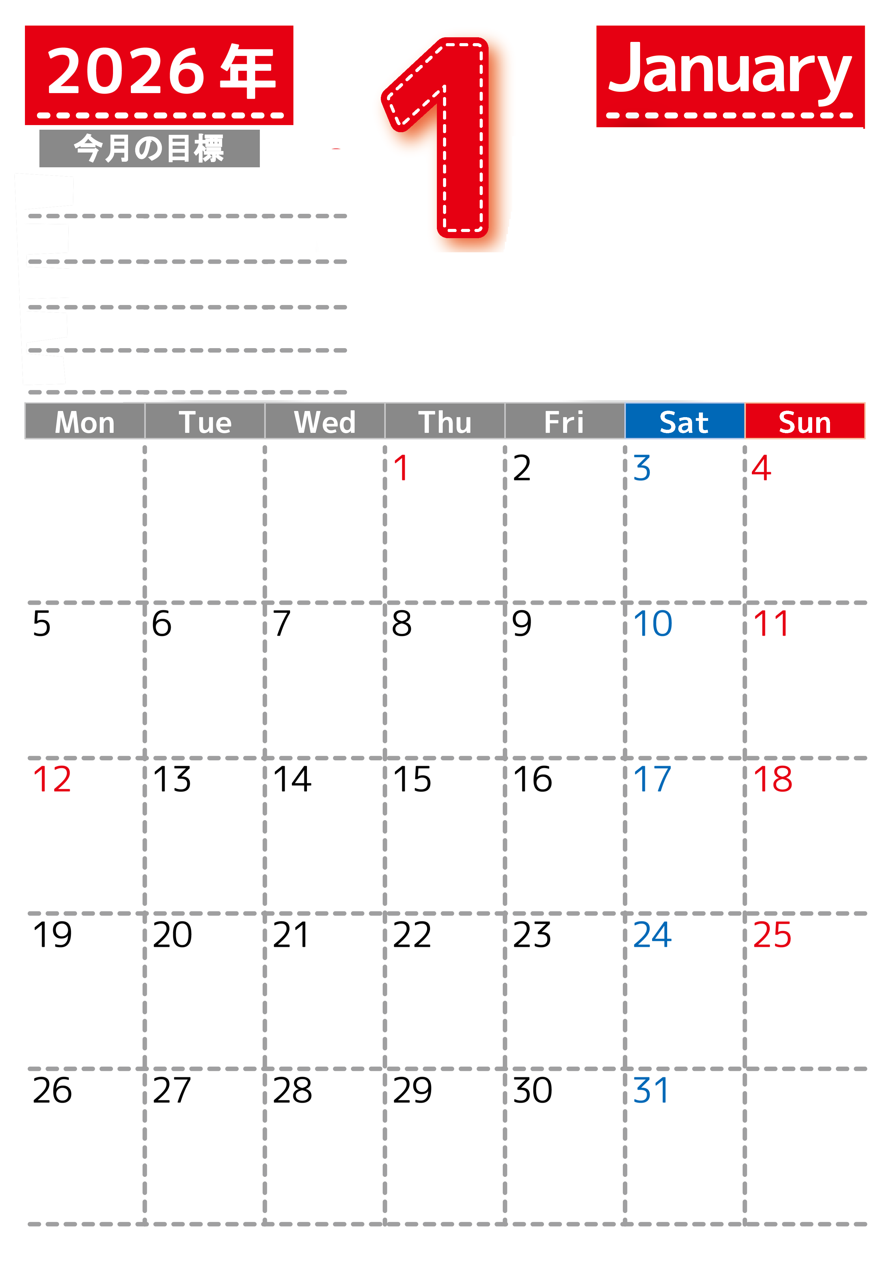 2026年・無料のカレンダーテンプレート 2026年1月カレンダーは縦型月曜始まりで目標の書き込み欄あり♪計画を計画のままで終わらせない無料A4♪(2026-01590111) 素材状デザイン王 2025年4月13日 2026年1月カレンダーは縦型月曜始まりで目標の書き込み欄があります。計画を計画のままで終わらせず、目標を達成するのにお役立てください。A4サイズ・無料です。(2026-01590111) 1月 縦型のカレンダー 月曜始まり 目標 カレンダーデザイン-0159