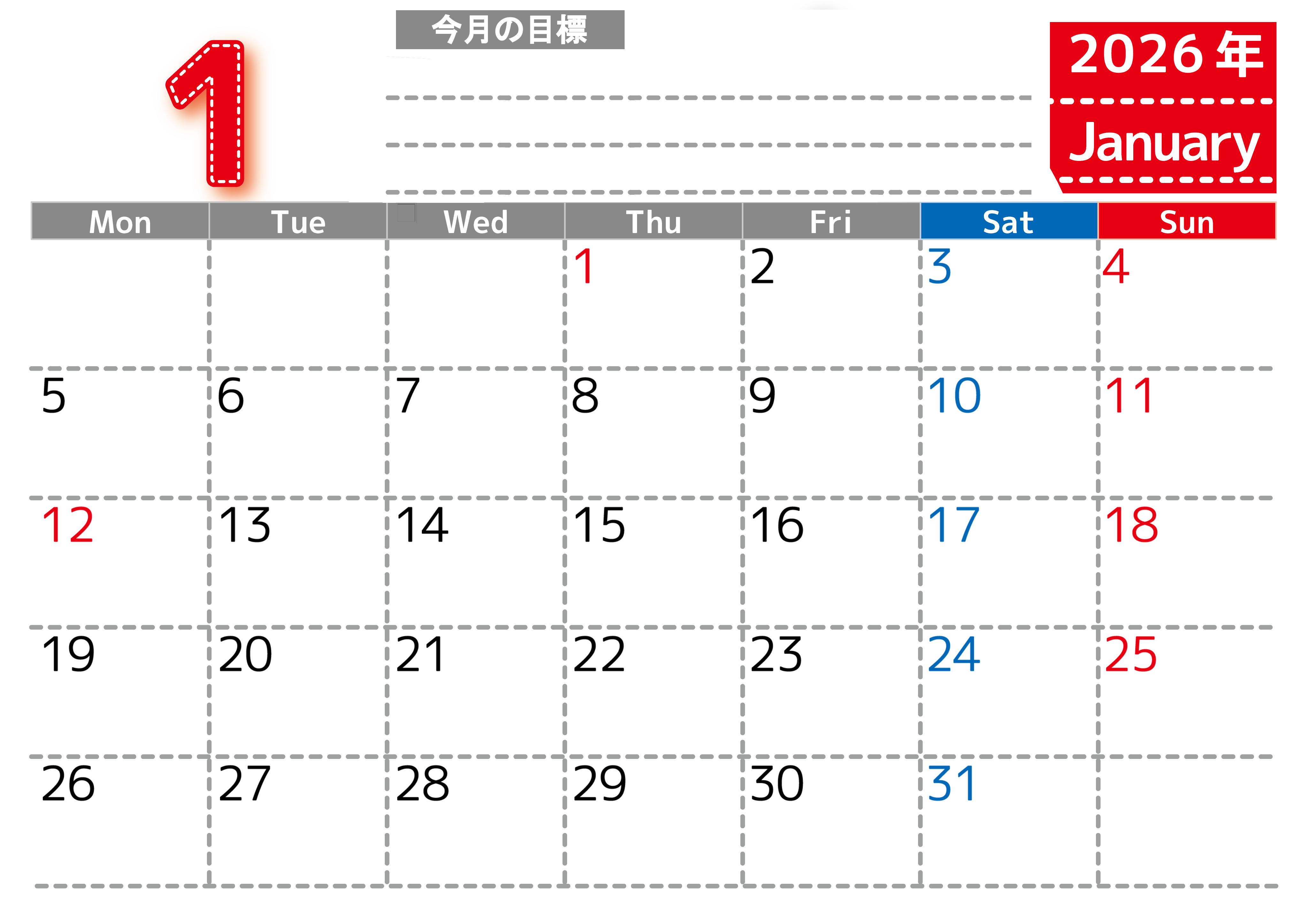 2026年・無料のカレンダーテンプレート 2026年1月カレンダーは横型月曜始まりで目標の書き込み欄あり♪計画を計画のままで終わらせない無料A4♪(2026-01590101) 素材状デザイン王 2025年4月13日 2026年1月カレンダーは横型月曜始まりで目標の書き込み欄があります。計画を計画のままで終わらせず、目標を達成するのにお役立てください。A4サイズ・無料です。(2026-01590101) 1月 横型のカレンダー 月曜始まり 目標 カレンダーデザイン-0159
