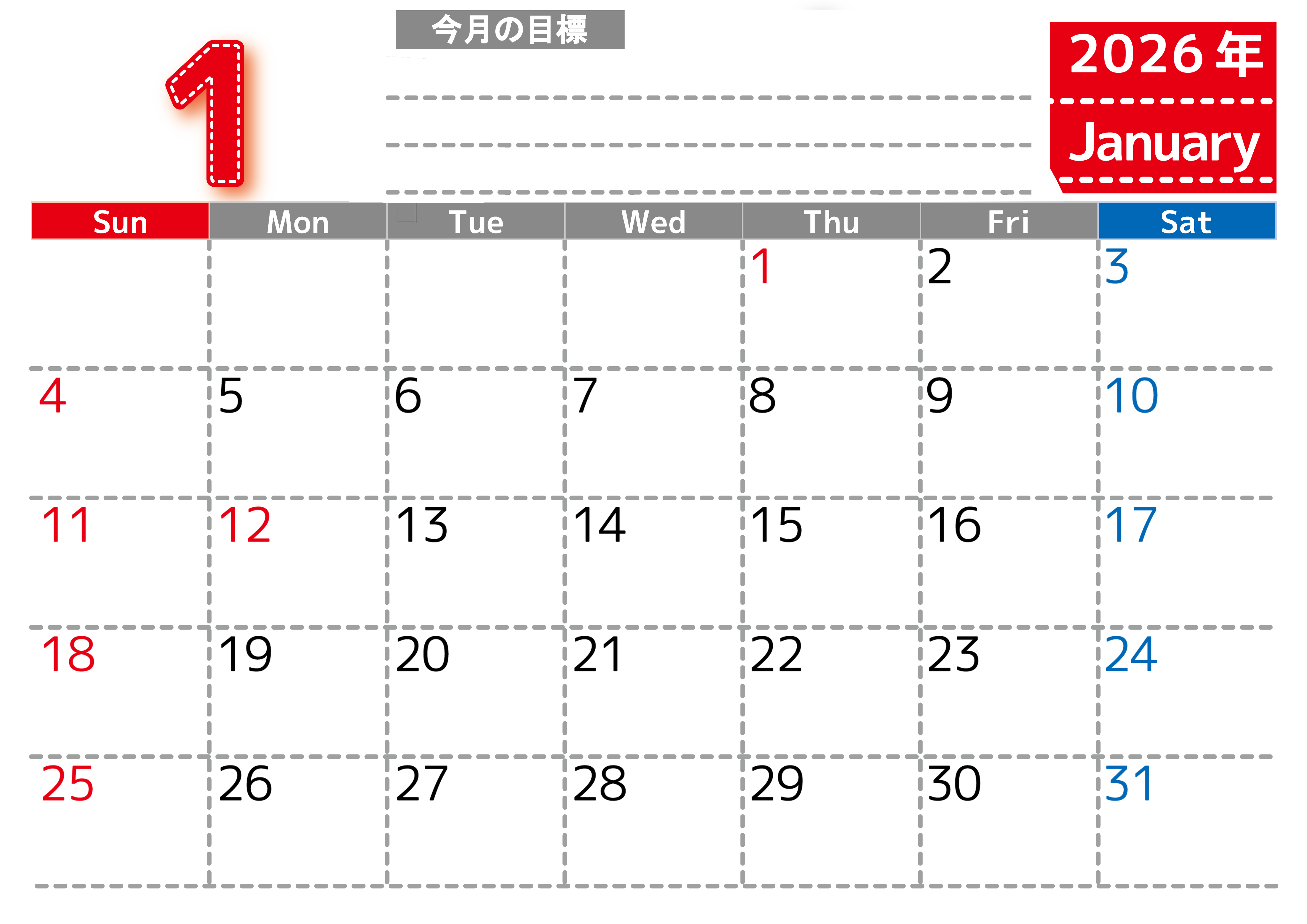 2026年・無料のカレンダーテンプレート 2026年1月カレンダーは横型日曜始まりで目標の書き込み欄あり♪計画を計画のままで終わらせない無料A4♪(2026-01590100) 素材状デザイン王 2025年4月13日 2026年1月カレンダーは横型日曜始まりで目標の書き込み欄があります。計画を計画のままで終わらせず、目標を達成するのにお役立てください。A4サイズ・無料です。(2026-01590100) 1月 横型のカレンダー 日曜始まり 目標 カレンダーデザイン-0159