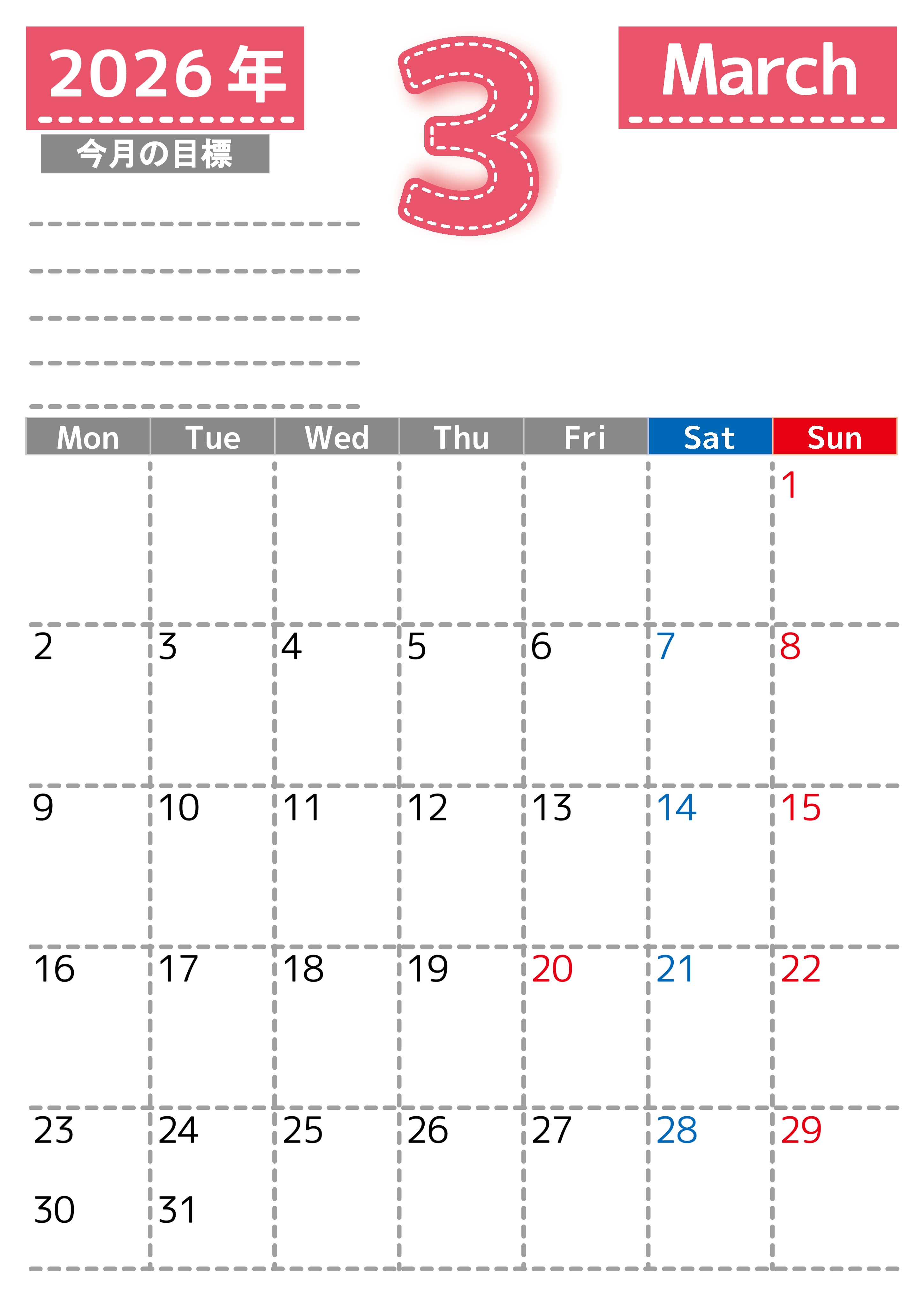 2026年3月カレンダーは縦型月曜始まりで目標の書き込み欄があります。計画を計画のままで終わらせず、目標を達成するのにお役立てください。A4サイズ・無料です。(2026-01590311)