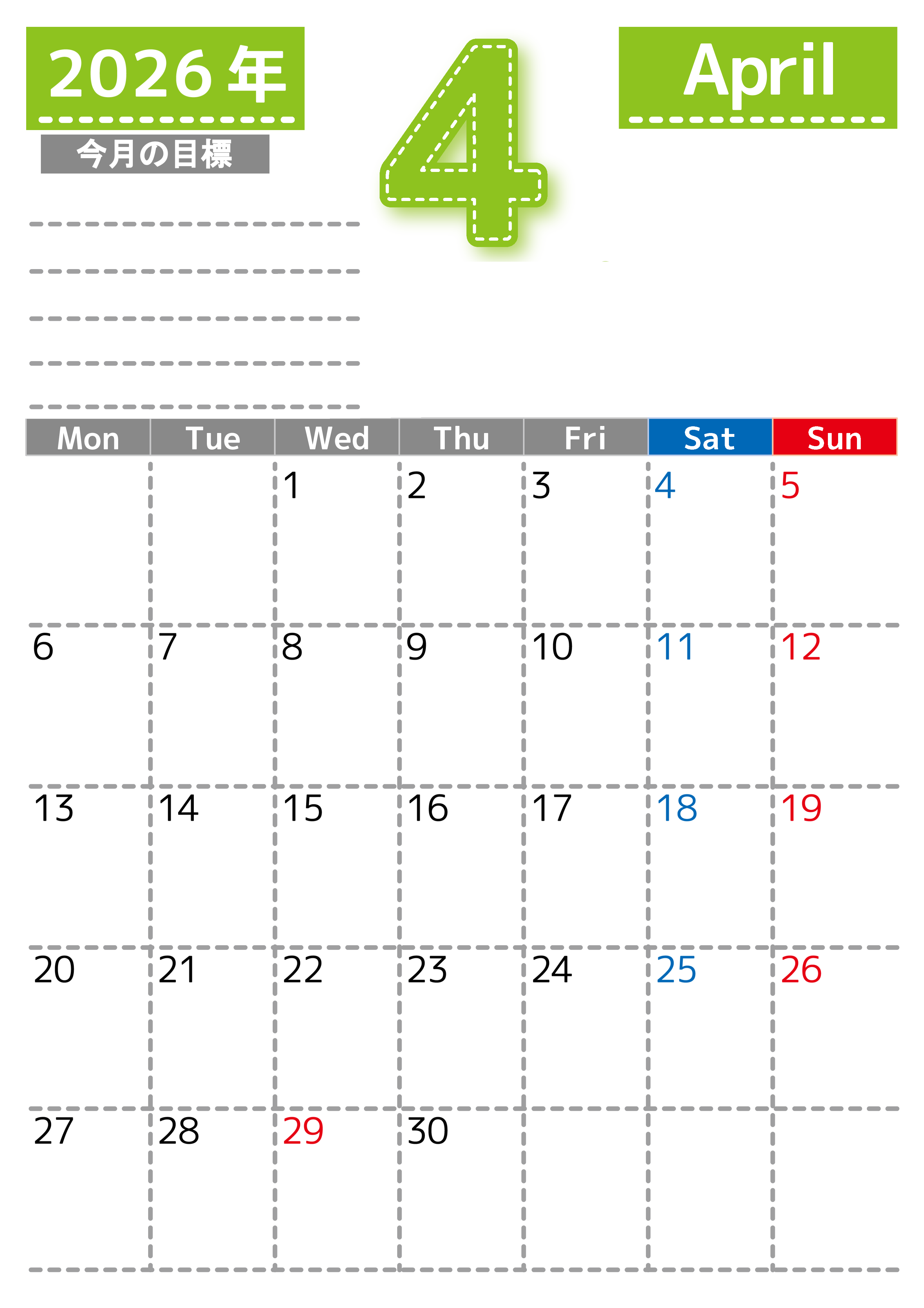 2026年・無料のカレンダーテンプレート 2026年4月カレンダーは縦型月曜始まりで目標の書き込み欄あり♪計画を計画のままで終わらせない無料A4♪(2026-01590411) 素材状デザイン王 2025年4月13日 2026年4月カレンダーは縦型月曜始まりで目標の書き込み欄があります。計画を計画のままで終わらせず、目標を達成するのにお役立てください。A4サイズ・無料です。(2026-01590411) 4月 縦型のカレンダー 月曜始まり 目標 カレンダーデザイン-0159