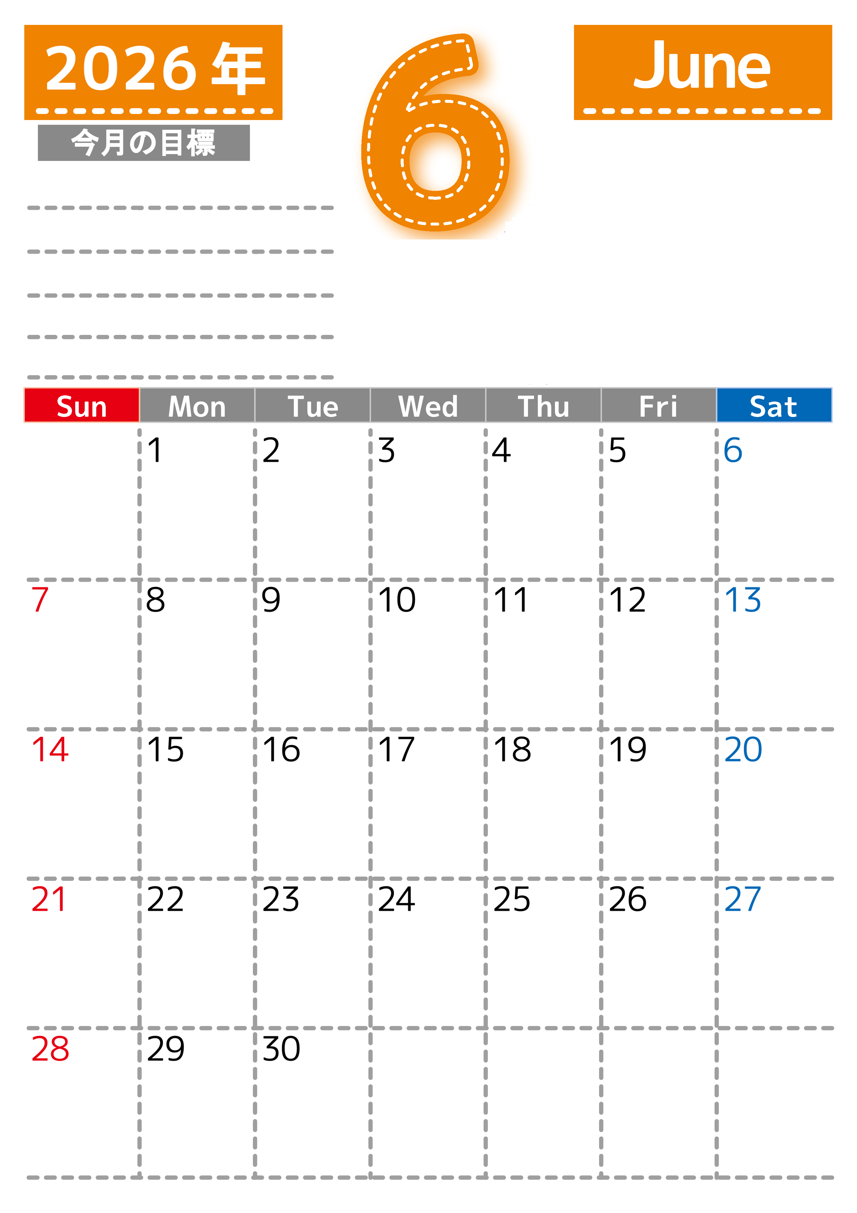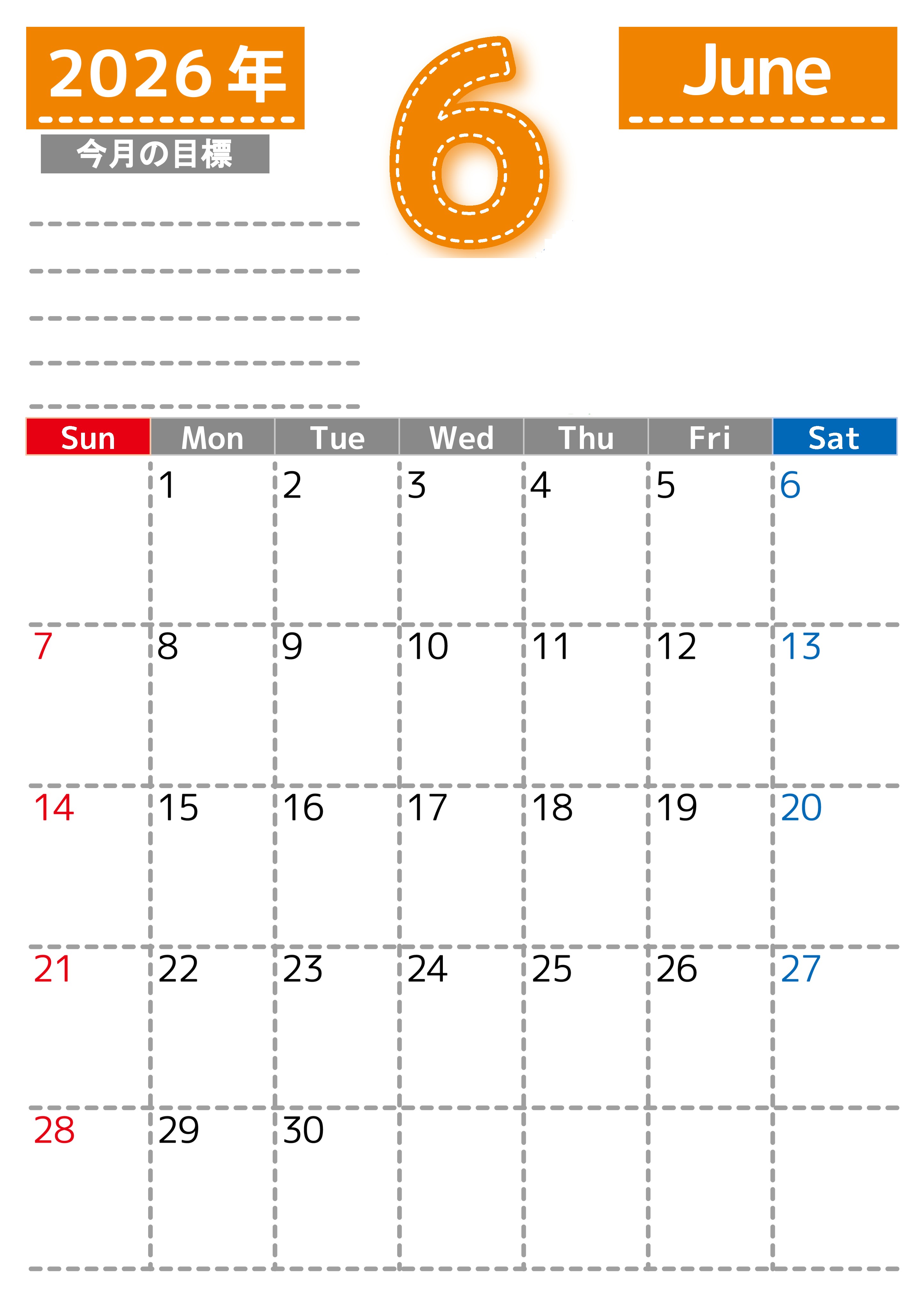 2026年・無料のカレンダーテンプレート 2026年6月カレンダーは縦型日曜始まりで目標の書き込み欄あり♪計画を計画のままで終わらせない無料A4♪(2026-01590610) 素材状デザイン王 2025年4月13日 2026年6月カレンダーは縦型日曜始まりで目標の書き込み欄があります。計画を計画のままで終わらせず、目標を達成するのにお役立てください。A4サイズ・無料です。(2026-01590610) 6月 縦型のカレンダー 日曜始まり 目標 カレンダーデザイン-0159