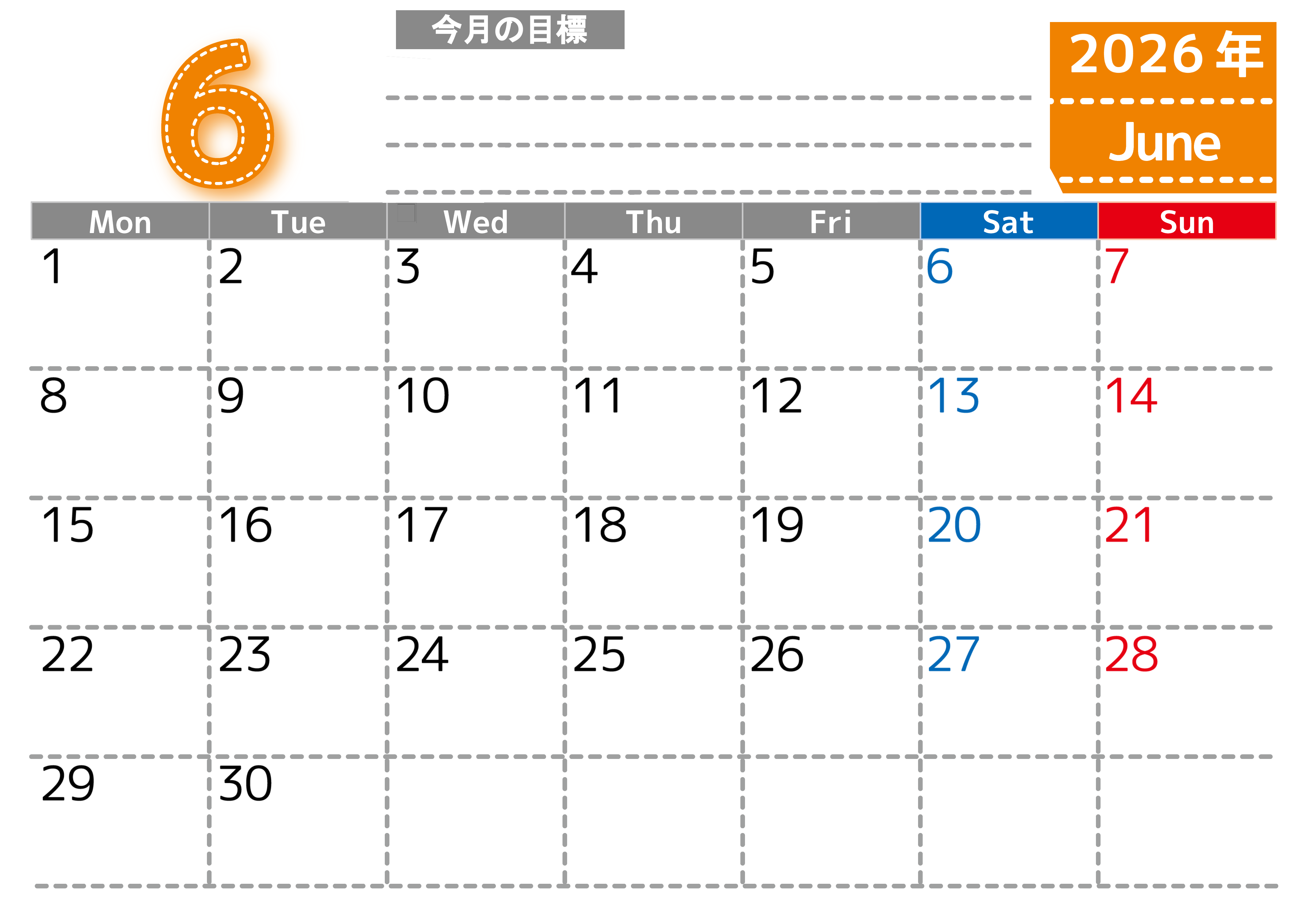 2026年6月カレンダーは横型月曜始まりで目標の書き込み欄があります。計画を計画のままで終わらせず、目標を達成するのにお役立てください。A4サイズ・無料です。(2026-01590601)