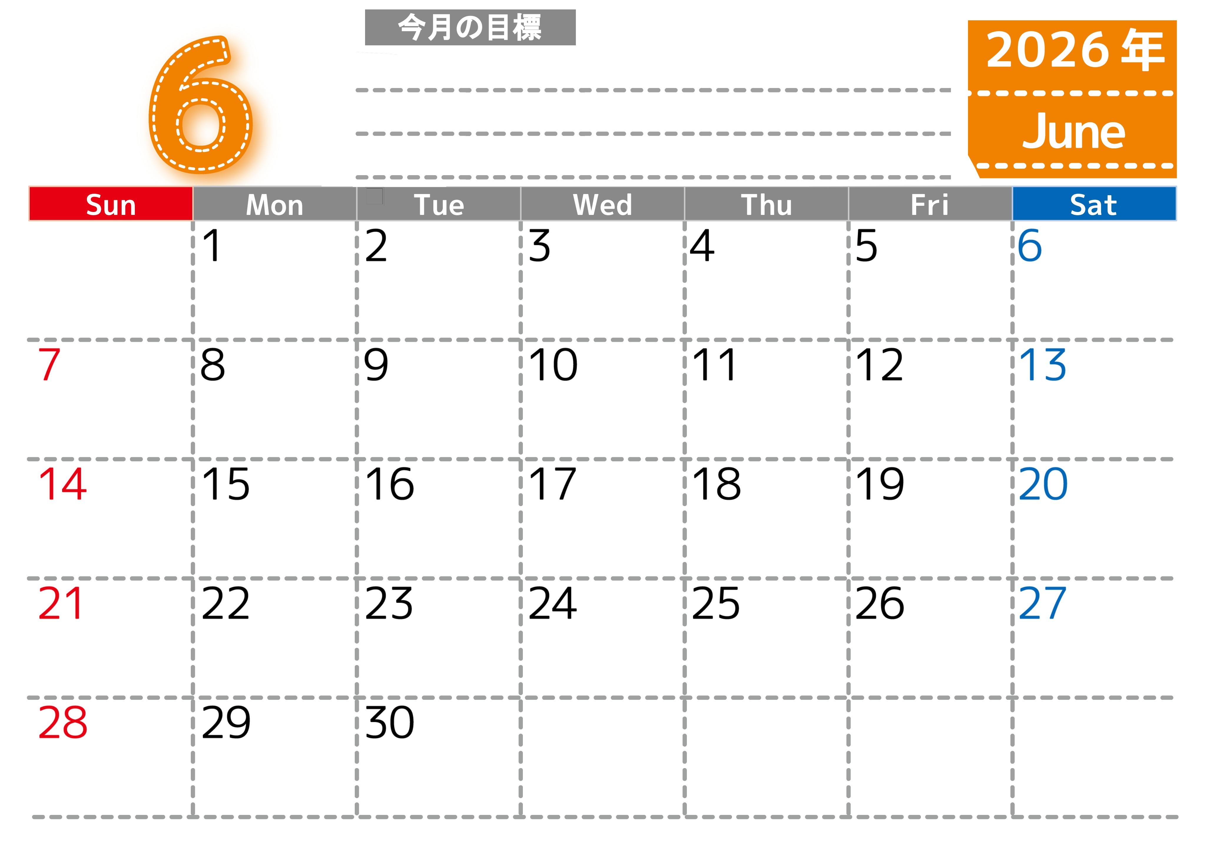 2026年・無料のカレンダーテンプレート 2026年6月カレンダーは横型日曜始まりで目標の書き込み欄あり♪計画を計画のままで終わらせない無料A4♪(2026-01590600) 素材状デザイン王 2025年4月13日 2026年6月カレンダーは横型日曜始まりで目標の書き込み欄があります。計画を計画のままで終わらせず、目標を達成するのにお役立てください。A4サイズ・無料です。(2026-01590600) 6月 横型のカレンダー 日曜始まり 目標 カレンダーデザイン-0159
