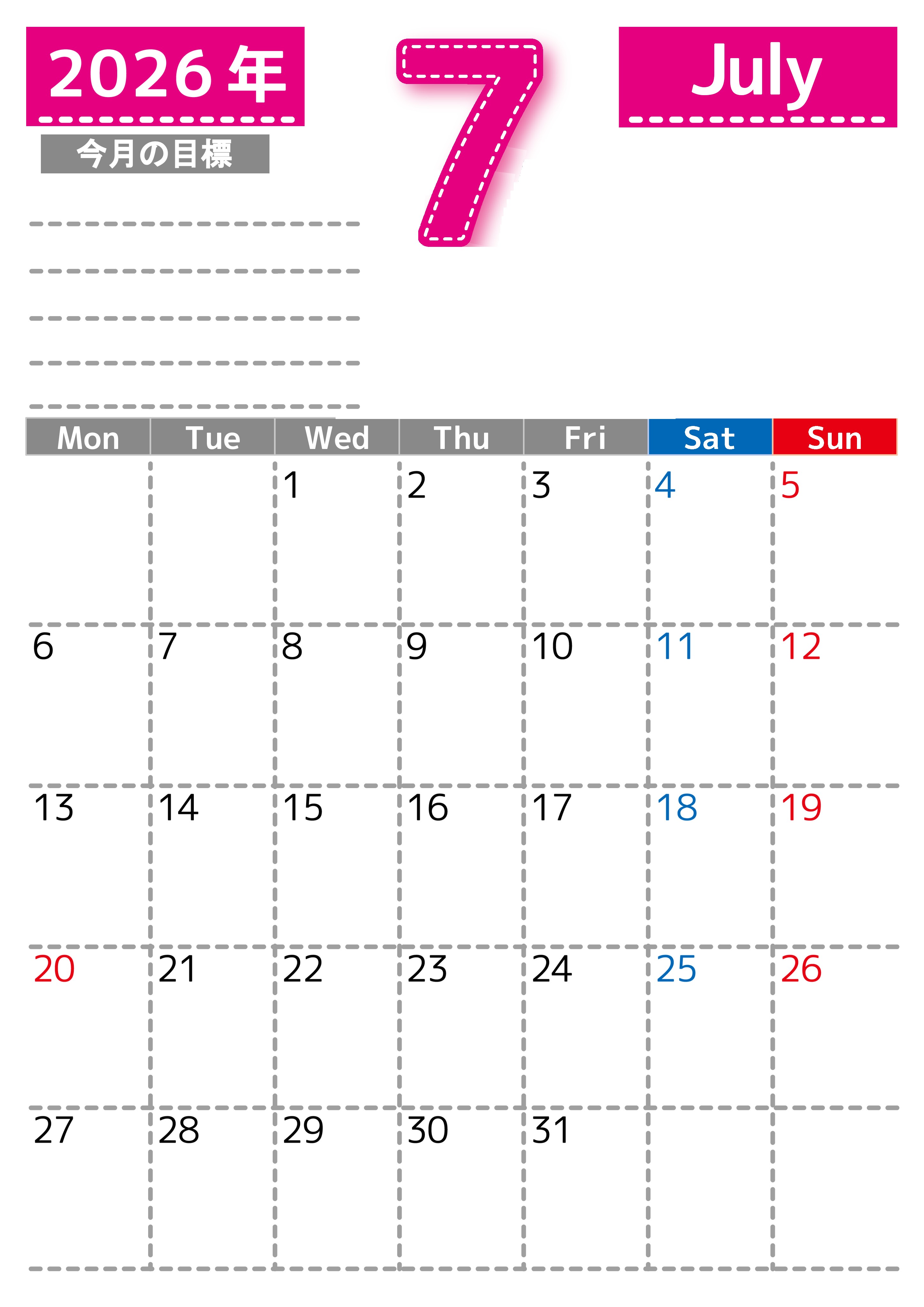 2026年7月カレンダーは縦型月曜始まりで目標の書き込み欄があります。計画を計画のままで終わらせず、目標を達成するのにお役立てください。A4サイズ・無料です。(2026-01590711)