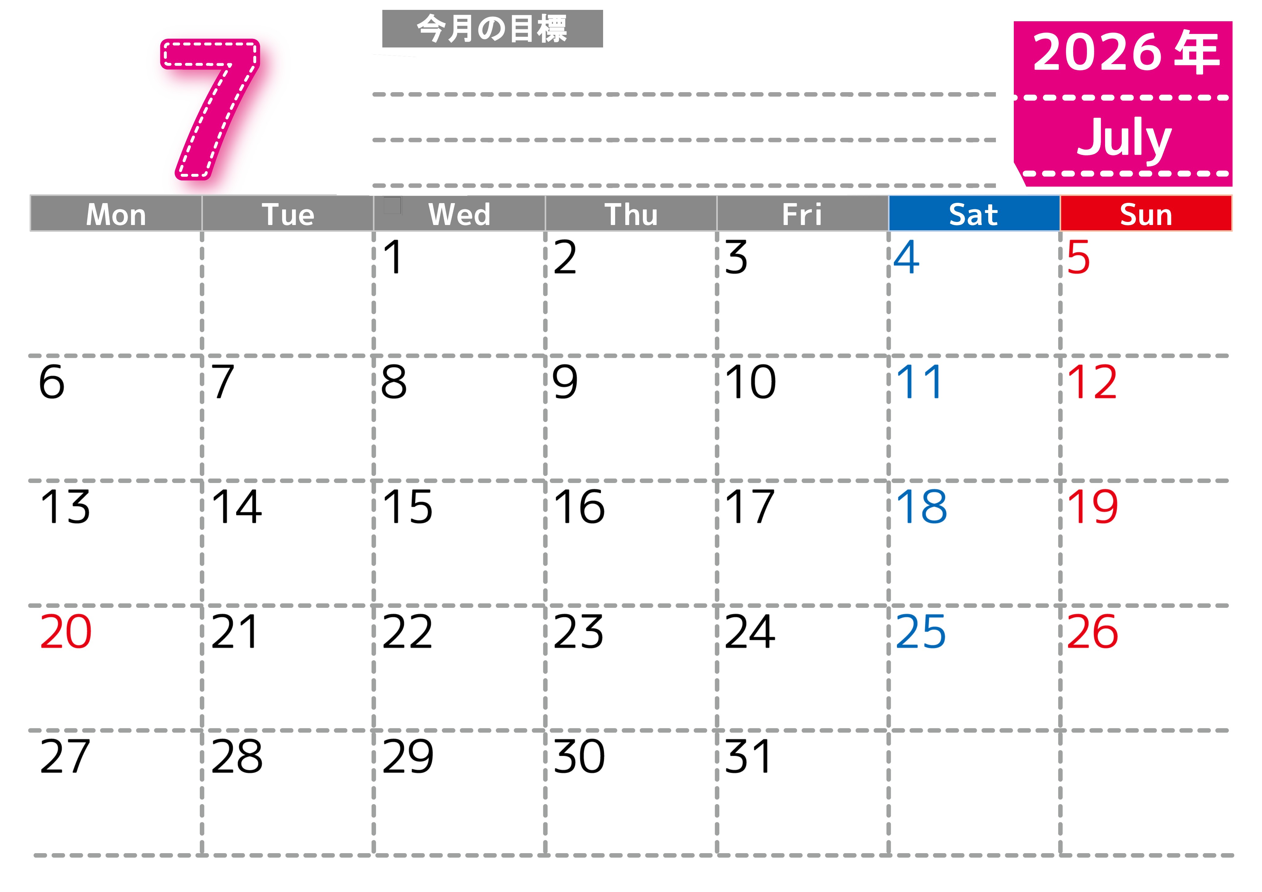 2026年・無料のカレンダーテンプレート 2026年7月カレンダーは横型月曜始まり でベージュの花がおしゃれ:無料(2026-01590701) 素材状デザイン王 2025年4月13日 2026年7月カレンダーは横型月曜始まりで目標の書き込み欄があります。計画を計画のままで終わらせず、目標を達成するのにお役立てください。A4サイズ・無料です。(2026-01590701) 7月 横型のカレンダー 月曜始まり 目標 カレンダーデザイン-0159