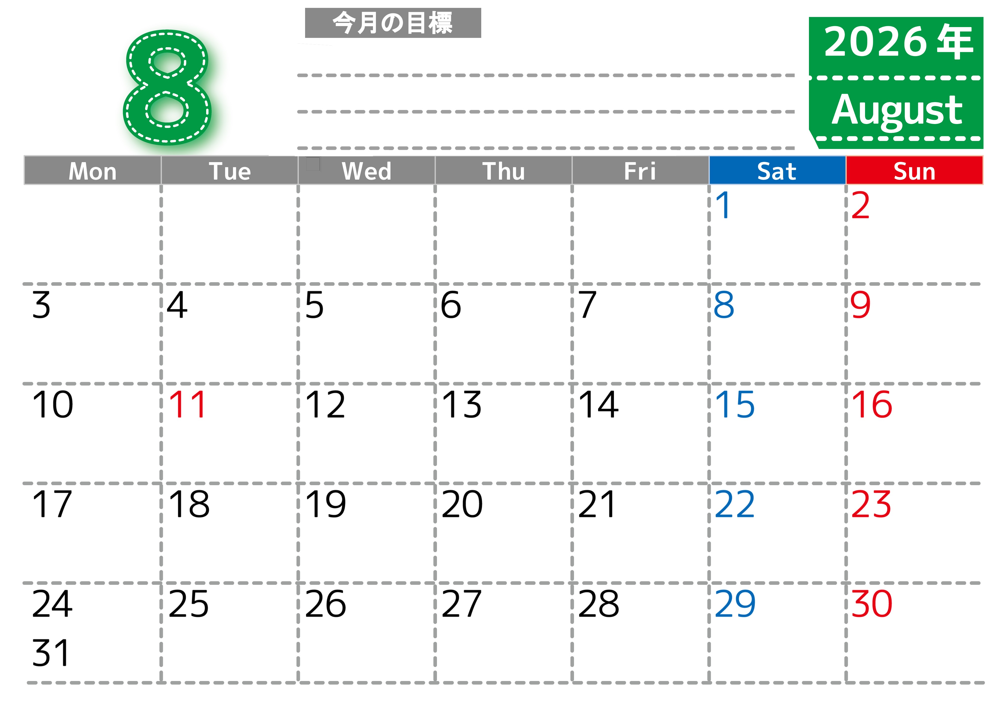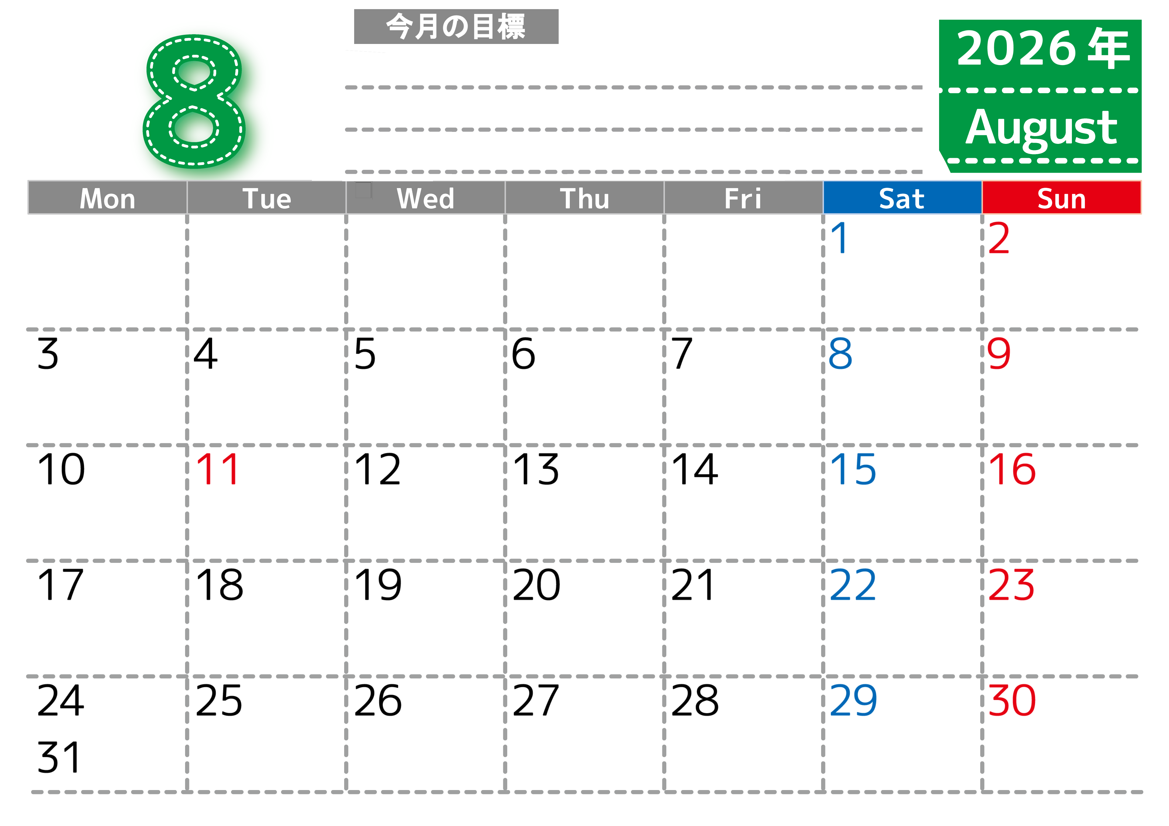 2026年・無料のカレンダーテンプレート 2026年8月カレンダーは横型月曜始まりで目標の書き込み欄あり♪計画を計画のままで終わらせない無料A4♪(2026-01590801) 素材状デザイン王 2025年4月13日 2026年8月カレンダーは横型月曜始まりで目標の書き込み欄があります。計画を計画のままで終わらせず、目標を達成するのにお役立てください。A4サイズ・無料です。(2026-01590801) 8月 横型のカレンダー 月曜始まり 目標 カレンダーデザイン-0159