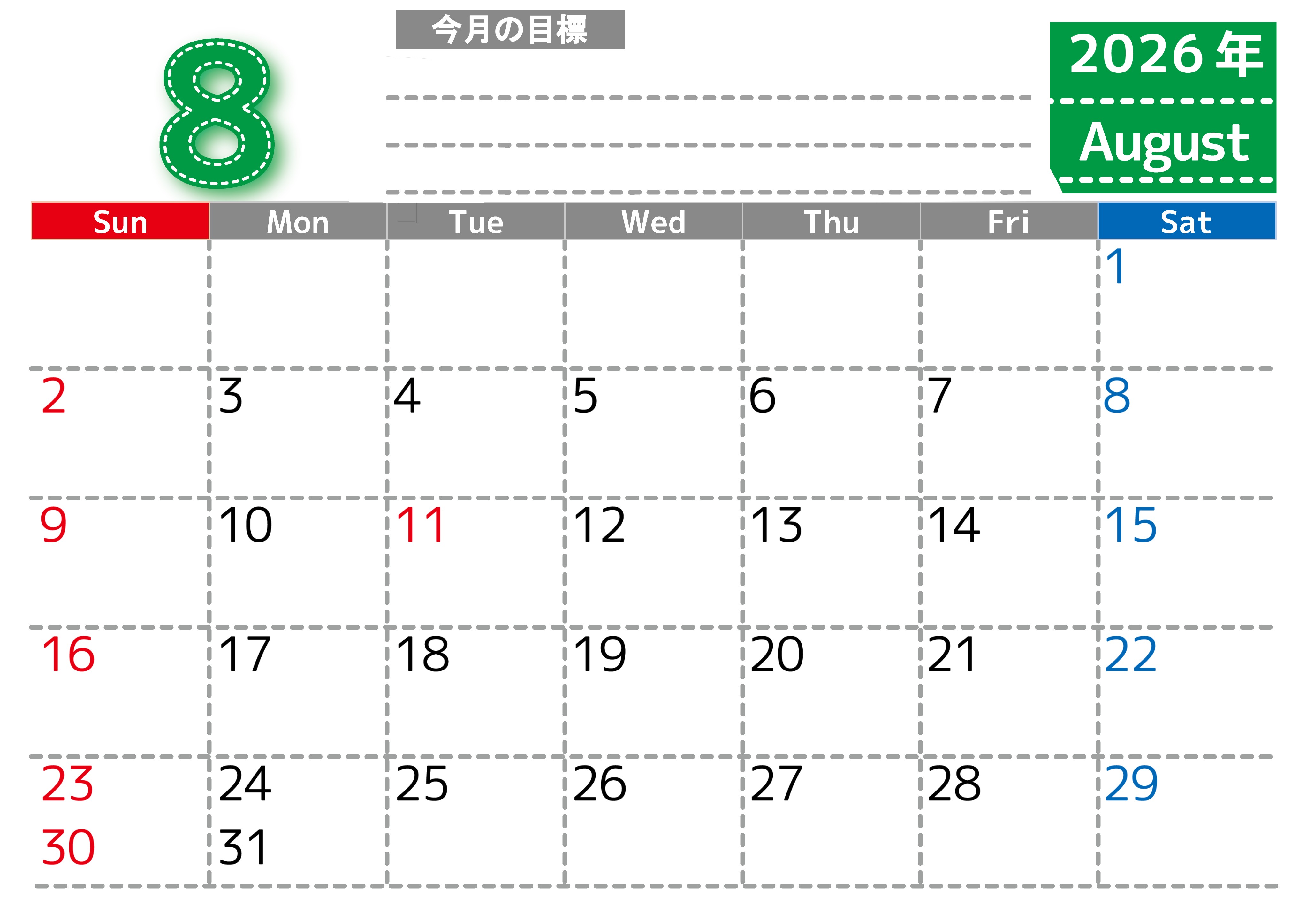 2026年・無料のカレンダーテンプレート 2026年8月カレンダーは横型日曜始まりで目標の書き込み欄あり♪計画を計画のままで終わらせない無料A4♪(2026-01590800) 素材状デザイン王 2025年4月13日 2026年8月カレンダーは横型日曜始まりで目標の書き込み欄があります。計画を計画のままで終わらせず、目標を達成するのにお役立てください。A4サイズ・無料です。(2026-01590800) 8月 横型のカレンダー 日曜始まり 目標 カレンダーデザイン-0159