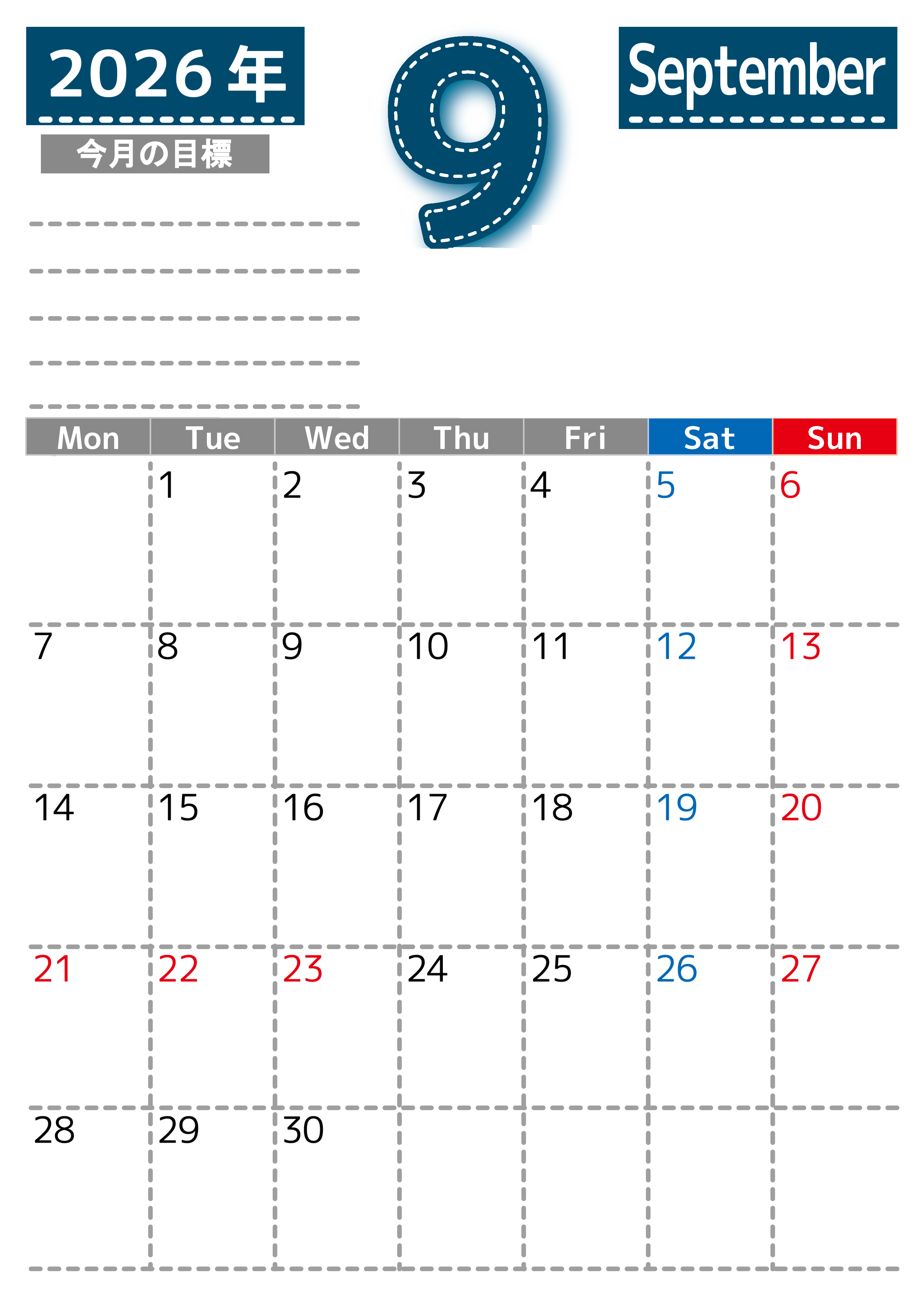 2026年9月カレンダーは縦型月曜始まりで目標の書き込み欄があります。計画を計画のままで終わらせず、目標を達成するのにお役立てください。A4サイズ・無料です。(2026-01590911)