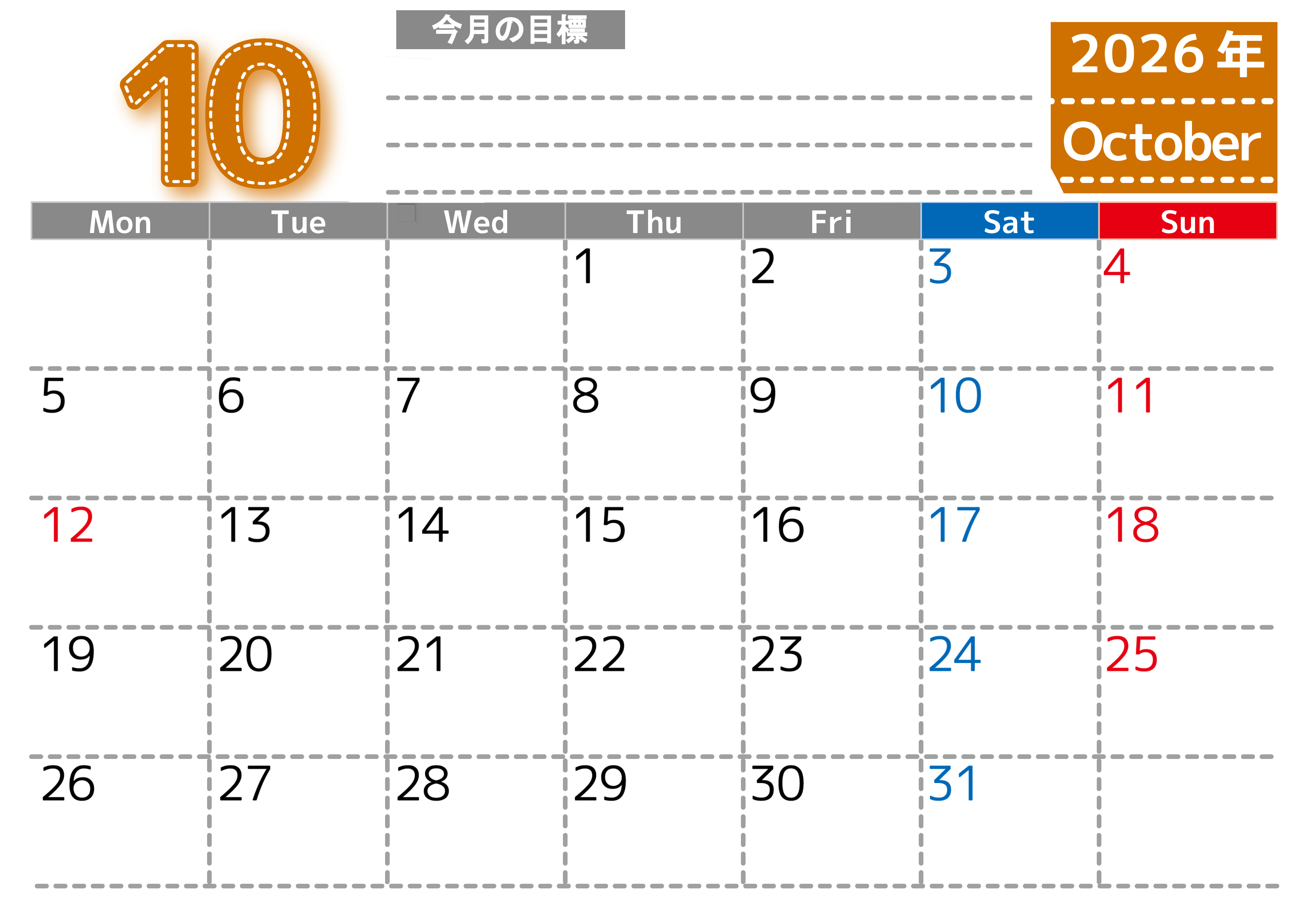2026年・無料のカレンダーテンプレート 2026年10月カレンダーは横型月曜始まりで目標の書き込み欄あり♪計画を計画のままで終わらせない無料A4♪(2026-01591001) 素材状デザイン王 2025年4月13日 2026年10月カレンダーは横型月曜始まりで目標の書き込み欄があります。計画を計画のままで終わらせず、目標を達成するのにお役立てください。A4サイズ・無料です。(2026-01591001) 10月 横型のカレンダー 月曜始まり 目標 カレンダーデザイン-0159