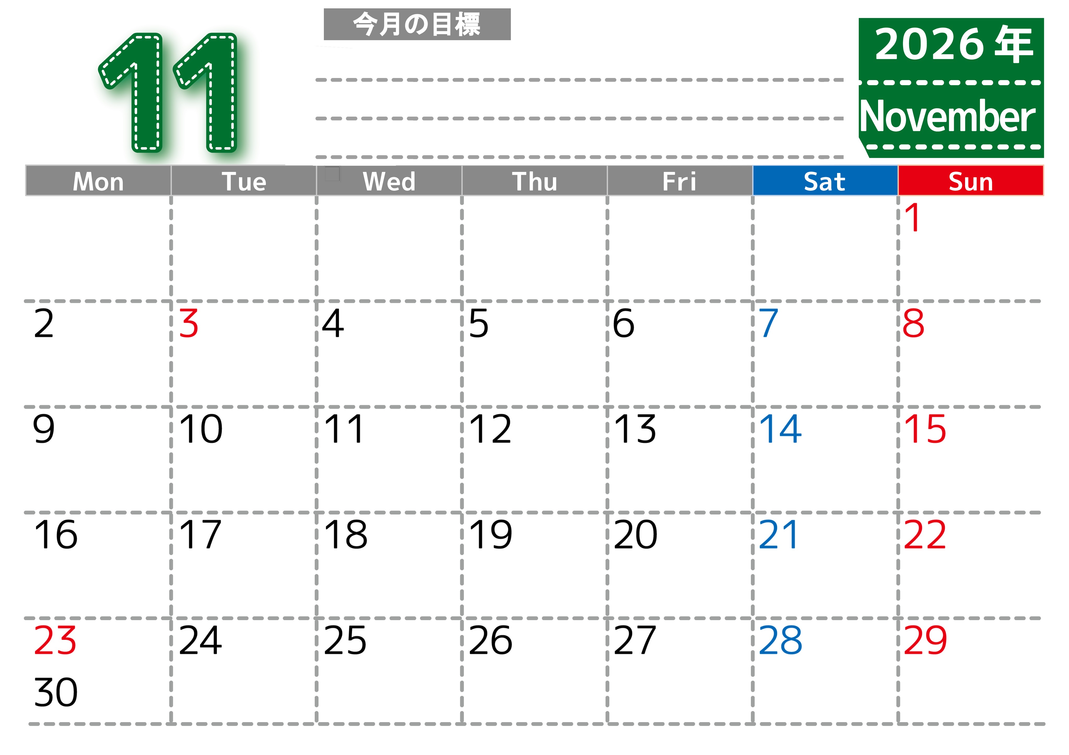 2026年・無料のカレンダーテンプレート 2026年11月カレンダーは横型月曜始まりで目標の書き込み欄あり♪計画を計画のままで終わらせない無料A4♪(2026-01591101) 素材状デザイン王 2025年4月13日 2026年11月カレンダーは横型月曜始まりで目標の書き込み欄があります。計画を計画のままで終わらせず、目標を達成するのにお役立てください。A4サイズ・無料です。(2026-01591101) 11月 横型のカレンダー 月曜始まり 目標 カレンダーデザイン-0159