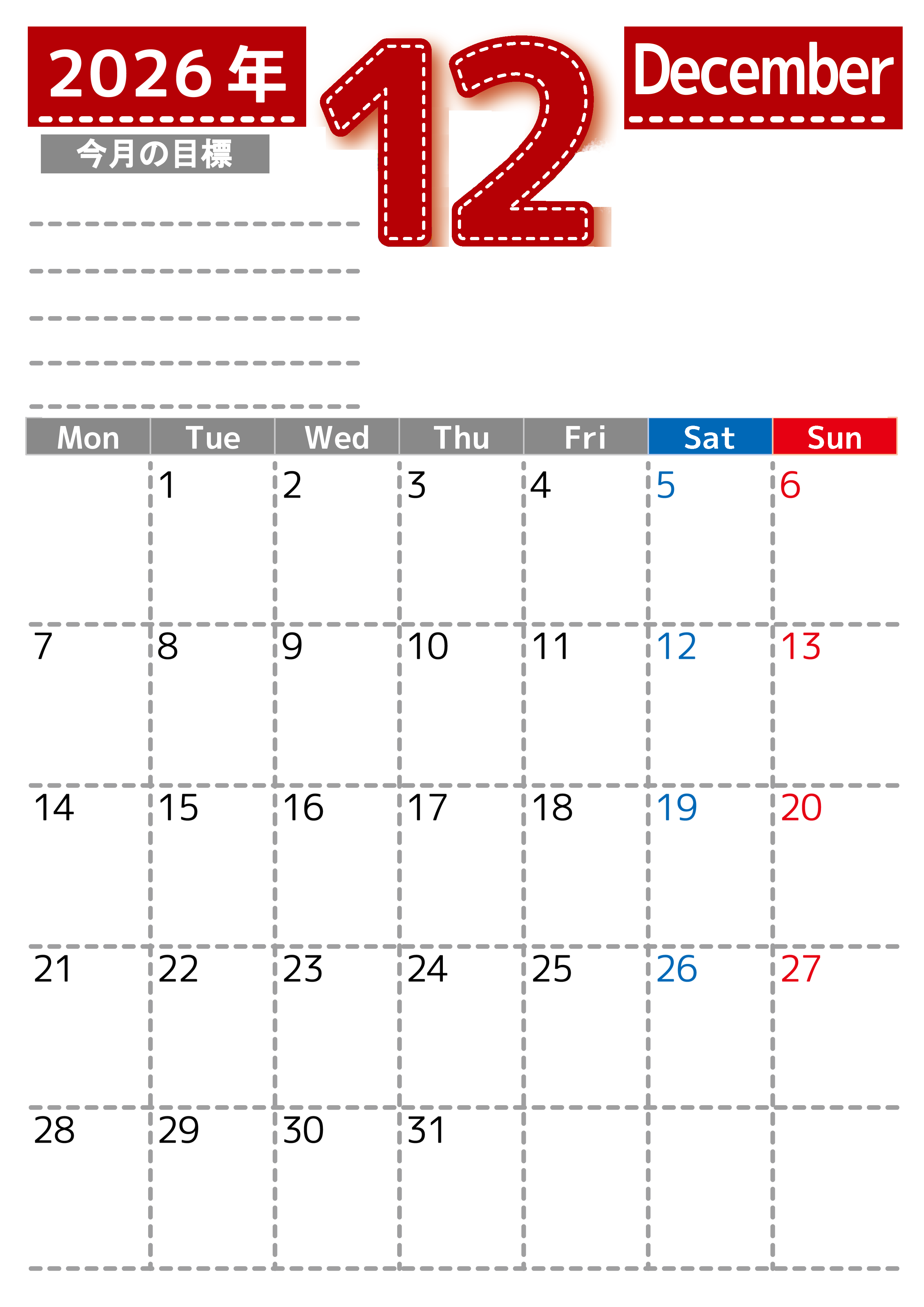 2026年・無料のカレンダーテンプレート 2026年12月カレンダーは縦型月曜始まりで目標の書き込み欄あり♪計画を計画のままで終わらせない無料A4♪(2026-01591211) 素材状デザイン王 2025年4月13日 2026年12月カレンダーは縦型月曜始まりで目標の書き込み欄があります。計画を計画のままで終わらせず、目標を達成するのにお役立てください。A4サイズ・無料です。(2026-01591211) 12月 縦型のカレンダー 月曜始まり 目標 カレンダーデザイン-0159