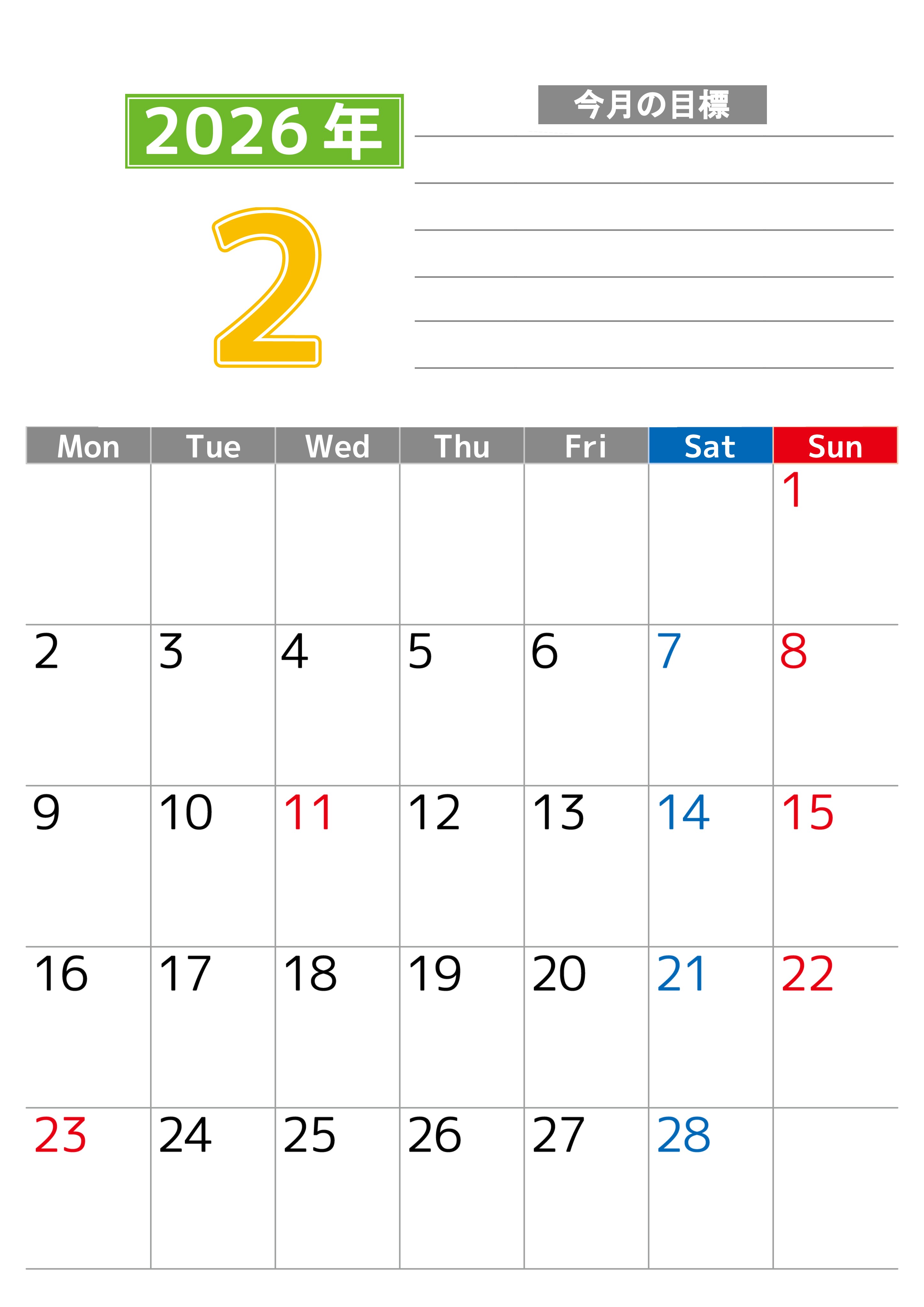 2026年・無料のカレンダーテンプレート 2026年2月カレンダーは縦型月曜始まりで勉強や仕事の目標を実現♪使いやすい無料A4サイズ♪(2026-01600211) 素材状デザイン王 2025年4月13日 2026年2月カレンダーは縦型月曜始まりで勉強や仕事の目標を実現しましょう。使いやすいダウンロードが無料なA4サイズのフリー素材です。(2026-01600211) 2月 縦型のカレンダー 月曜始まり 目標 カレンダーデザイン-0160