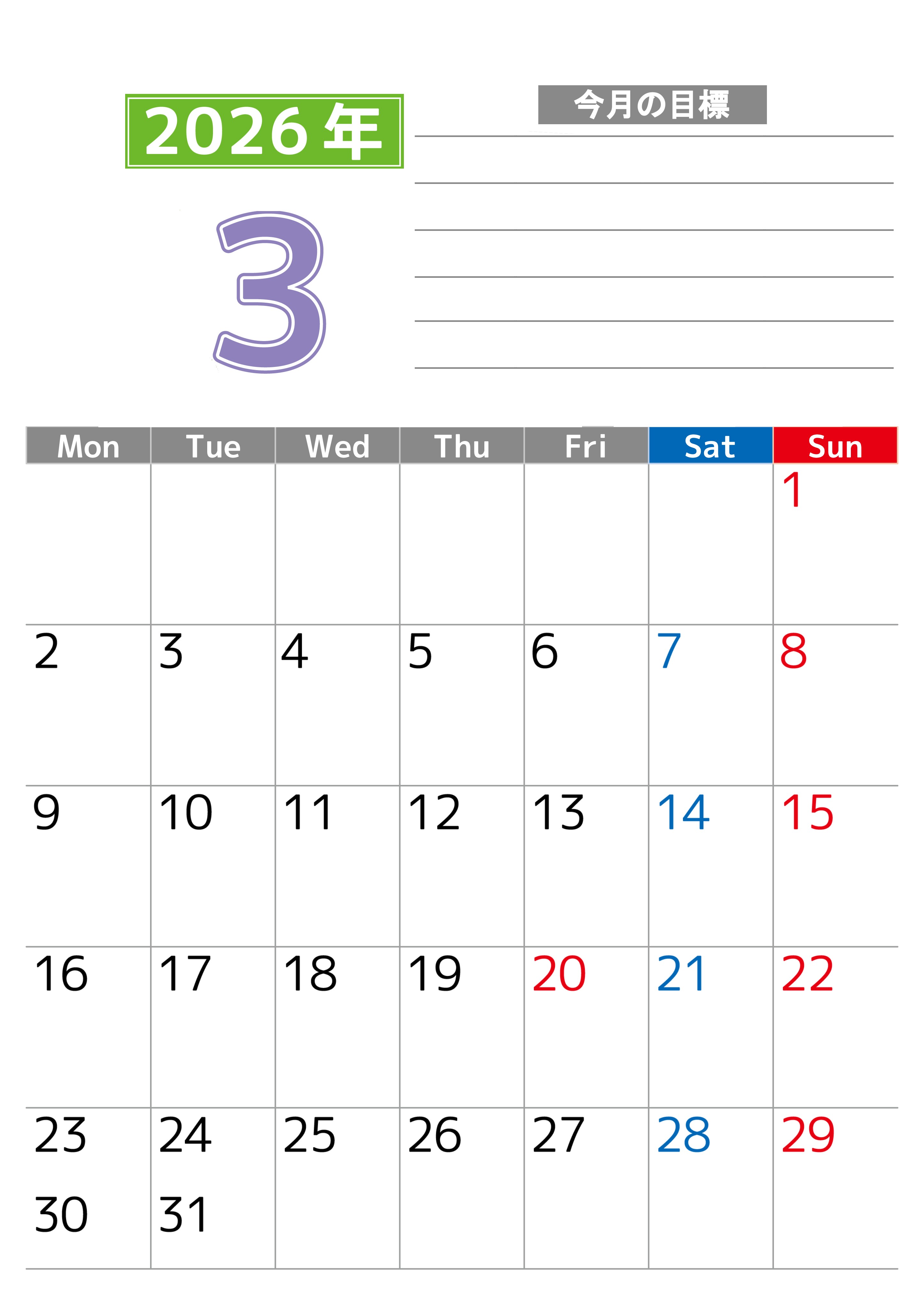 2026年・無料のカレンダーテンプレート 2026年3月カレンダーは縦型月曜始まりで勉強や仕事の目標を実現♪使いやすい無料A4サイズ♪(2026-01600311) 素材状デザイン王 2025年4月13日 2026年3月カレンダーは縦型月曜始まりで勉強や仕事の目標を実現しましょう。使いやすいダウンロードが無料なA4サイズのフリー素材です。(2026-01600311) 3月 縦型のカレンダー 月曜始まり 目標 カレンダーデザイン-0160