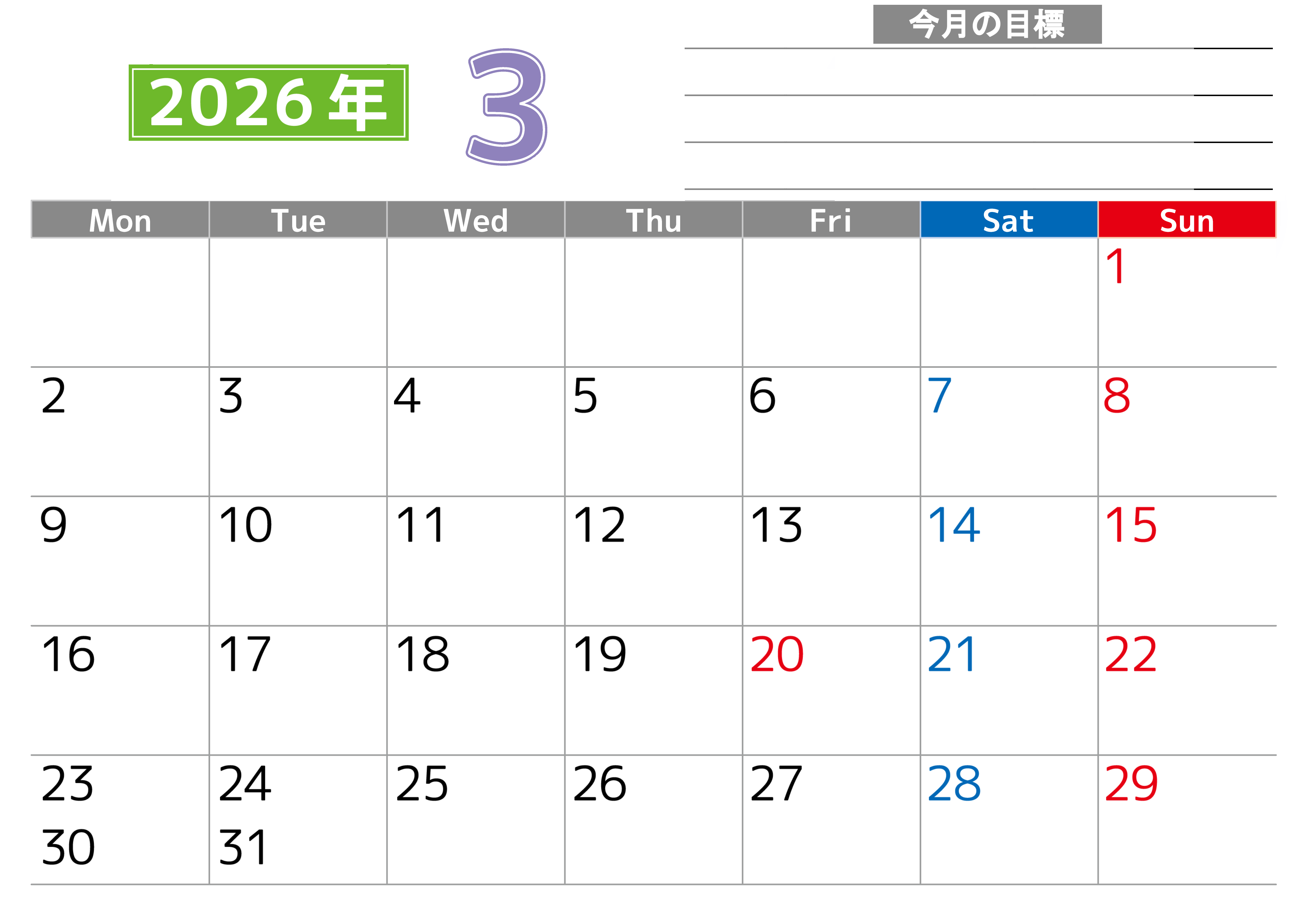 2026年・無料のカレンダーテンプレート 2026年3月カレンダーは横型月曜始まりで勉強や仕事の目標を実現♪使いやすい無料A4サイズ♪(2026-01600301) 素材状デザイン王 2025年4月13日 2026年3月カレンダーは横型月曜始まりで勉強や仕事の目標を実現しましょう。使いやすいダウンロードが無料なA4サイズのフリー素材です。(2026-01600301) 3月 横型のカレンダー 月曜始まり 目標 カレンダーデザイン-0160