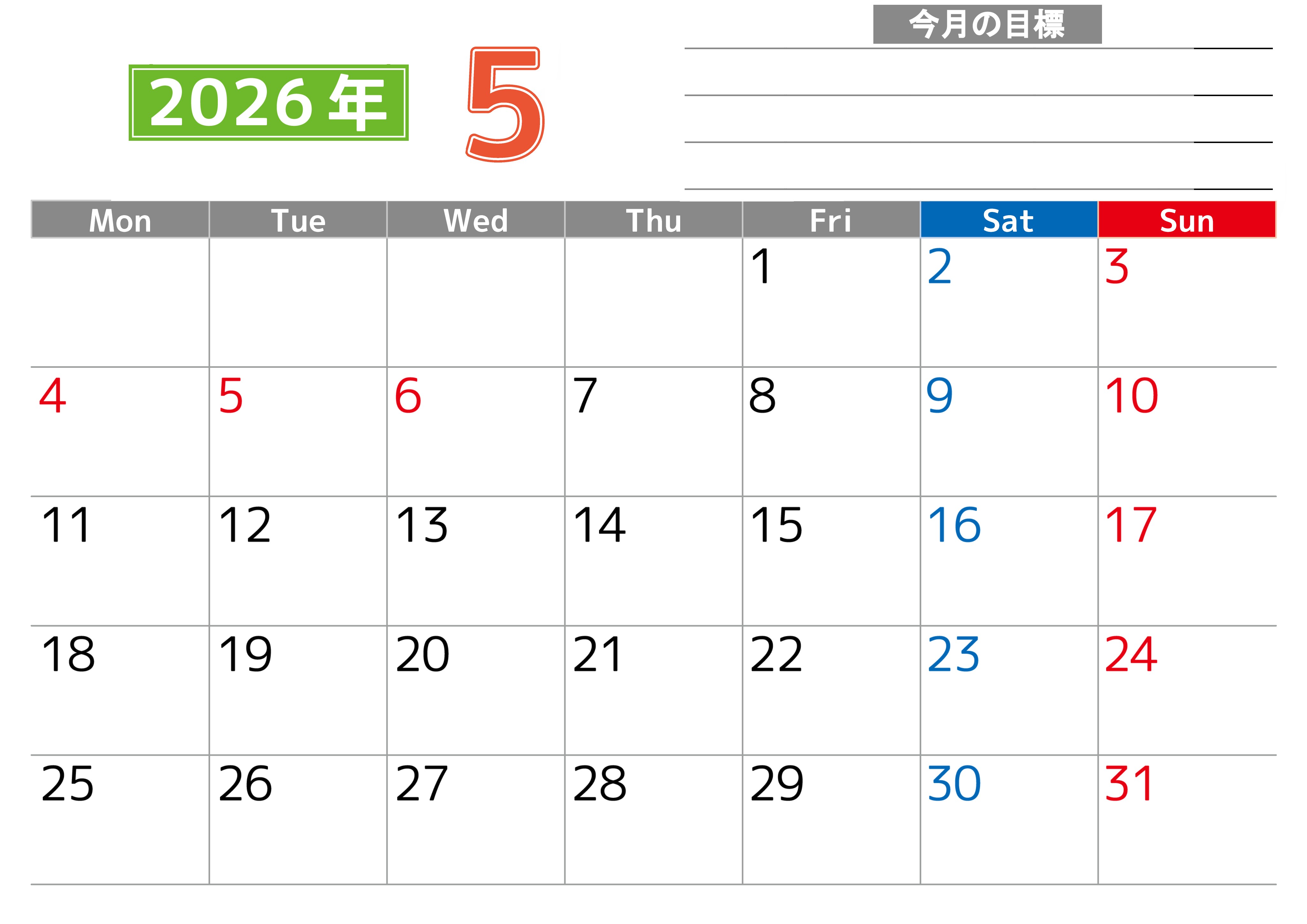 2026年5月カレンダーは横型月曜始まりで勉強や仕事の目標を実現しましょう。使いやすいダウンロードが無料なA4サイズのフリー素材です。(2026-01600501)