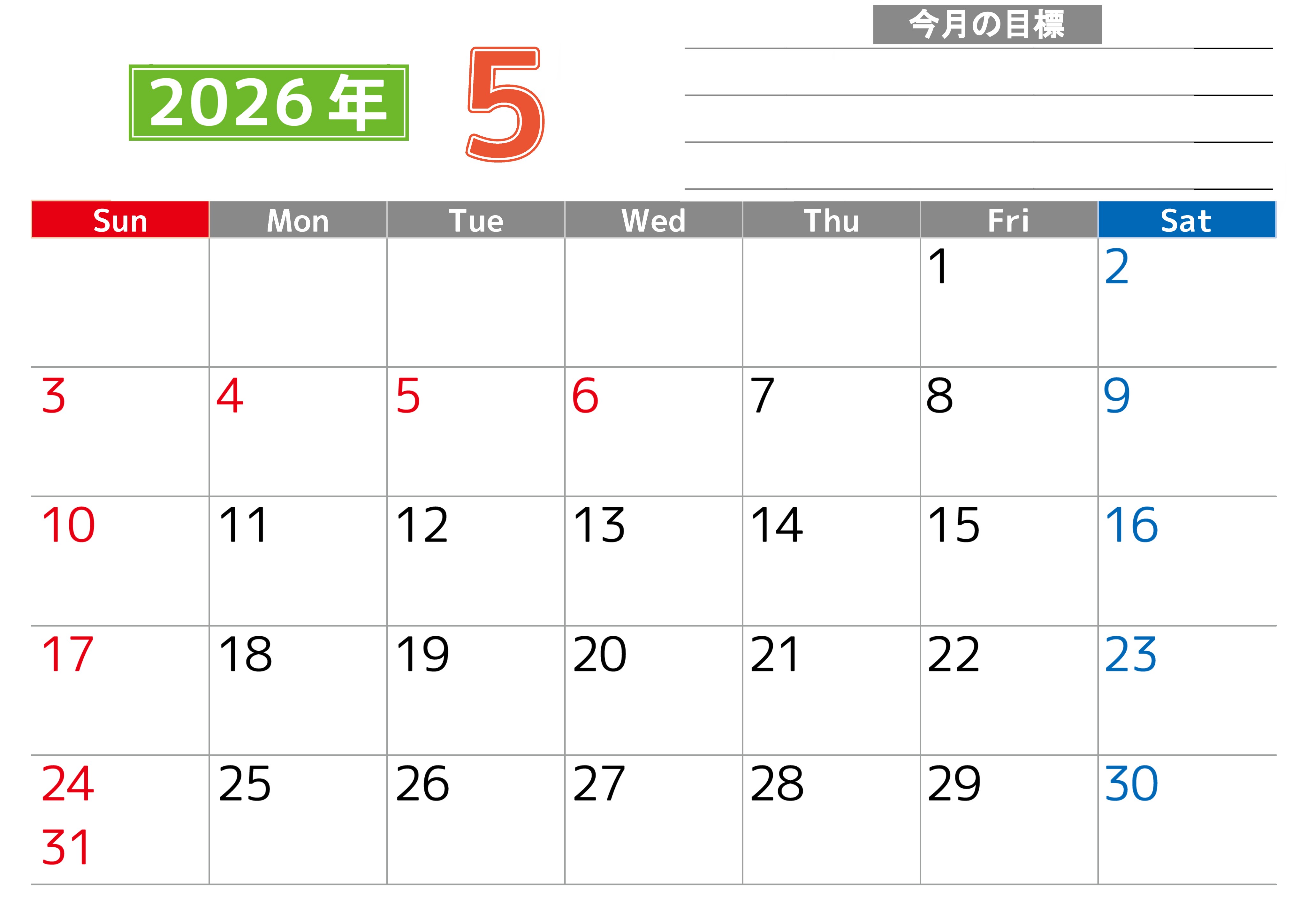 2026年・無料のカレンダーテンプレート 2026年5月カレンダーは横型日曜始まりで勉強や仕事の目標を実現♪使いやすい無料A4サイズ♪(2026-01600500) 素材状デザイン王 2025年4月13日 2026年5月カレンダーは横型日曜始まりで勉強や仕事の目標を実現しましょう。使いやすいダウンロードが無料なA4サイズのフリー素材です。(2026-01600500) 5月 横型のカレンダー 日曜始まり 目標 カレンダーデザイン-0160