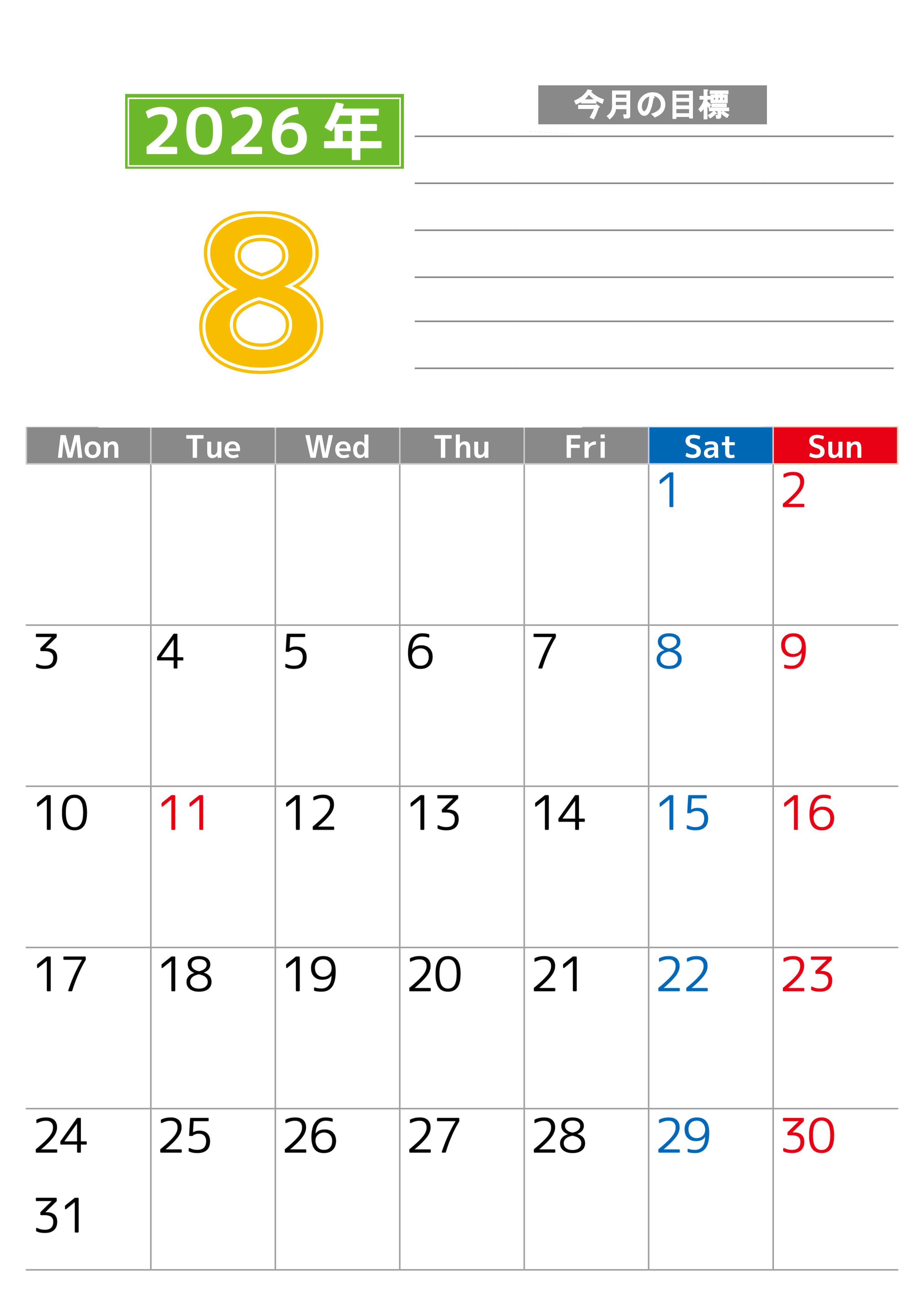 2026年8月カレンダーは縦型月曜始まりで勉強や仕事の目標を実現♪使いやすい無料A4サイズ♪(2026-01600811)