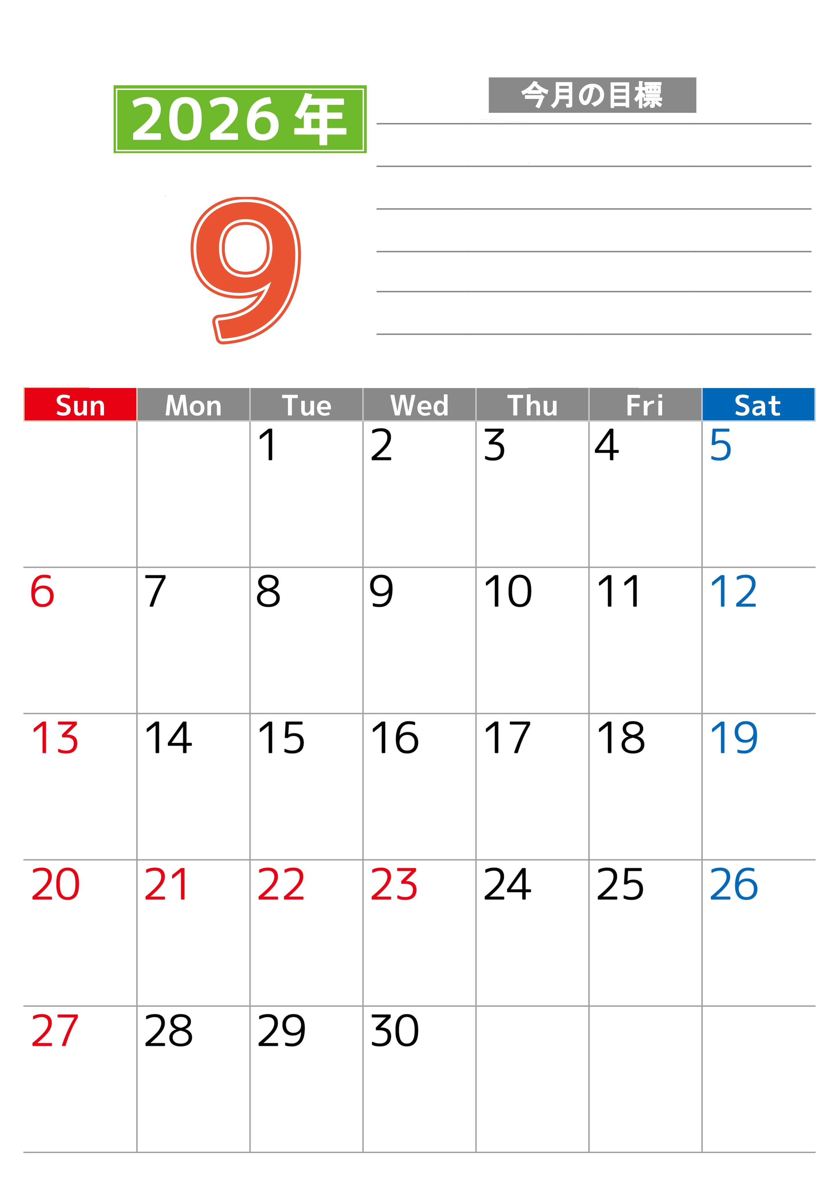 2026年・無料のカレンダーテンプレート 2026年9月カレンダーは縦型日曜始まりで勉強や仕事の目標を実現♪使いやすい無料A4サイズ♪(2026-01600910) 素材状デザイン王 2025年4月13日 2026年9月カレンダーは縦型日曜始まりで勉強や仕事の目標を実現しましょう。使いやすいダウンロードが無料なA4サイズのフリー素材です。(2026-01600910) 9月 縦型のカレンダー 日曜始まり 目標 カレンダーデザイン-0160